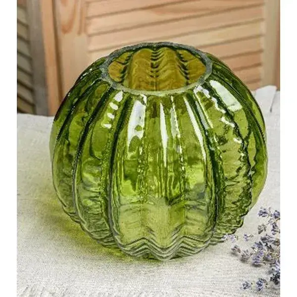 Стеклянная ваза 'Плиссе' сочетает в себе изысканный дизайн и функциональность. Её округлая форма, напоминающая тыкву, создаёт уютную атмосферу, а рифлёная поверхность добавляет текстурный акцент в любой декор.