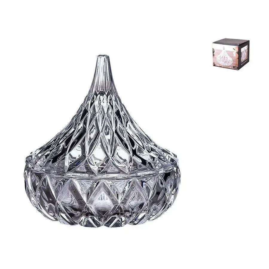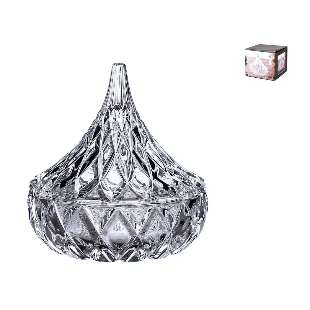 Стеклянная ваза с крышкой сочетает функциональность и декоративность — идеальное решение для кухни, столовой или создания стильного интерьера. Многоугольные грани создают эффект драгоценного кристалла, преломляя свет и добавляя изысканности любому пространству.