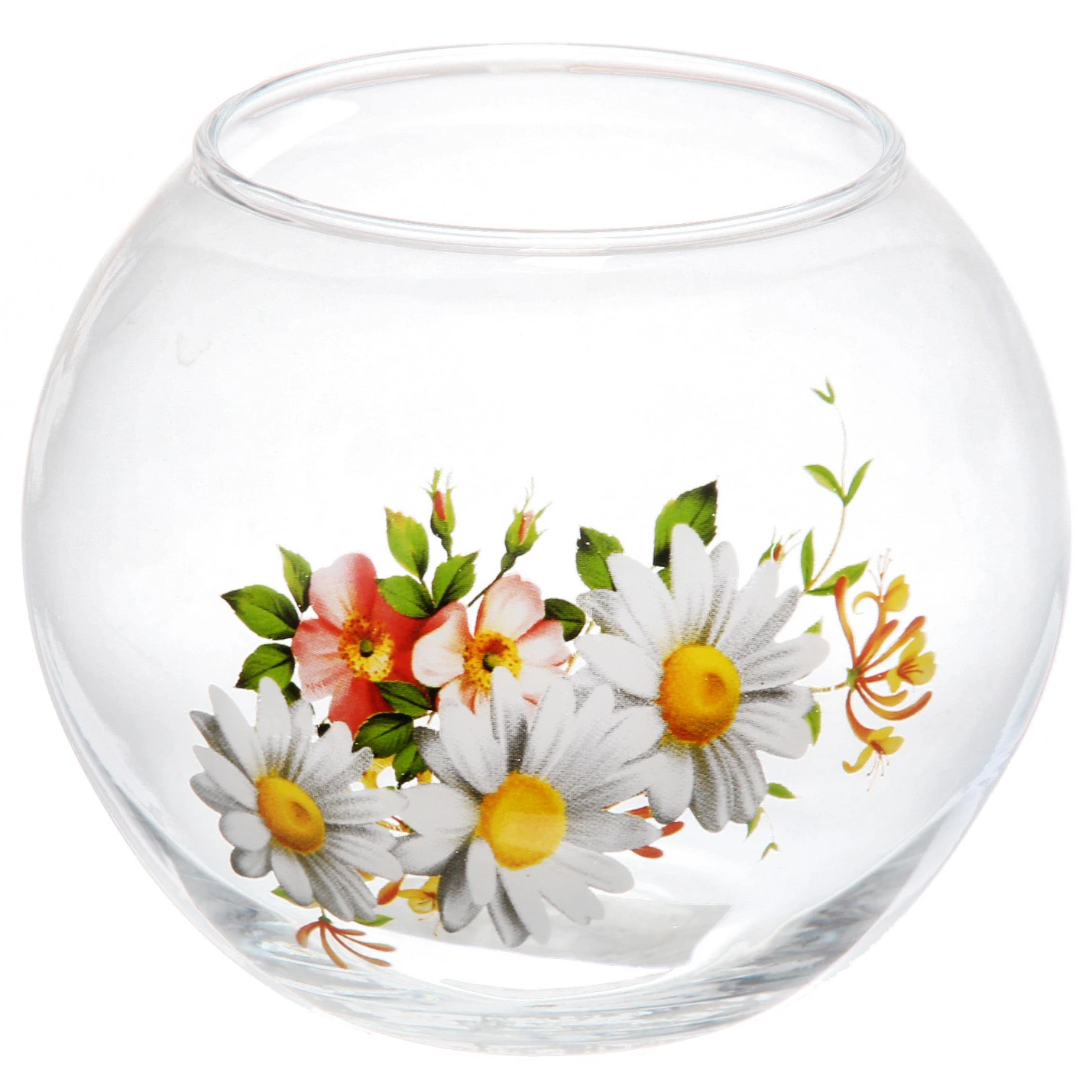 - Выразительный дизайн: уникальный рисунок «Ромашковое поле» нанесён на поверхность стекла. Композиция из белых, розовых и жёлтых цветов с зелёными листьями выглядит живо и нарядно.