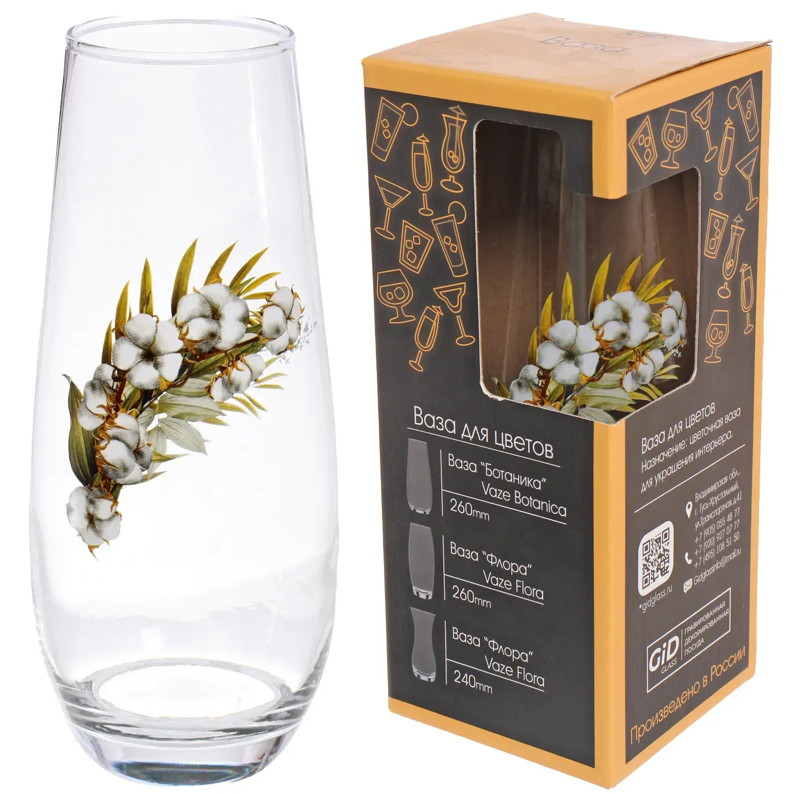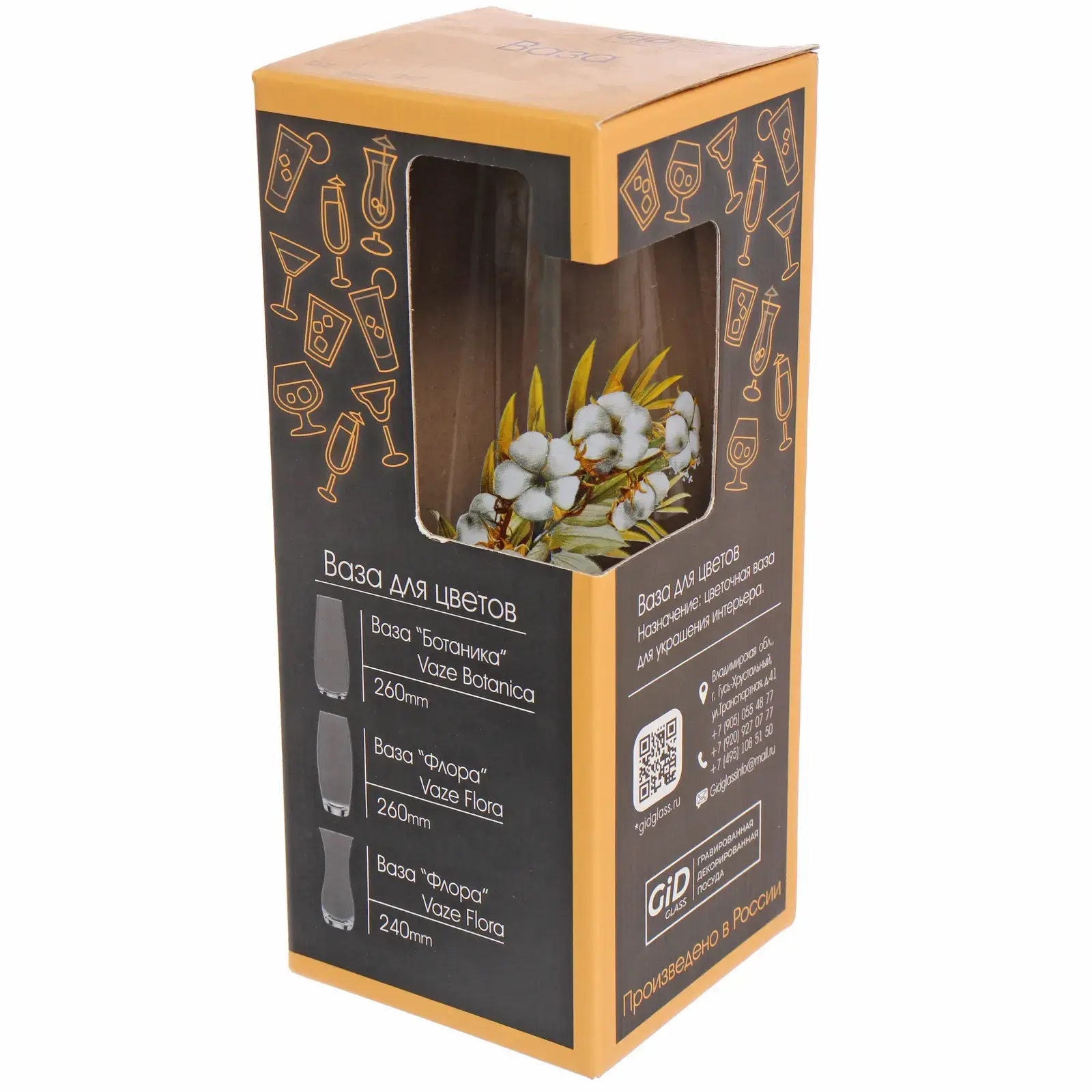 Высота вазы составляет 260 мм, что делает ее идеальной для размещения на столе или подоконнике. Прозрачный цвет позволяет сочетать вазу с любыми цветами и декором. Упаковка выполнена из картона, что обеспечивает надежную защиту при транспортировке.