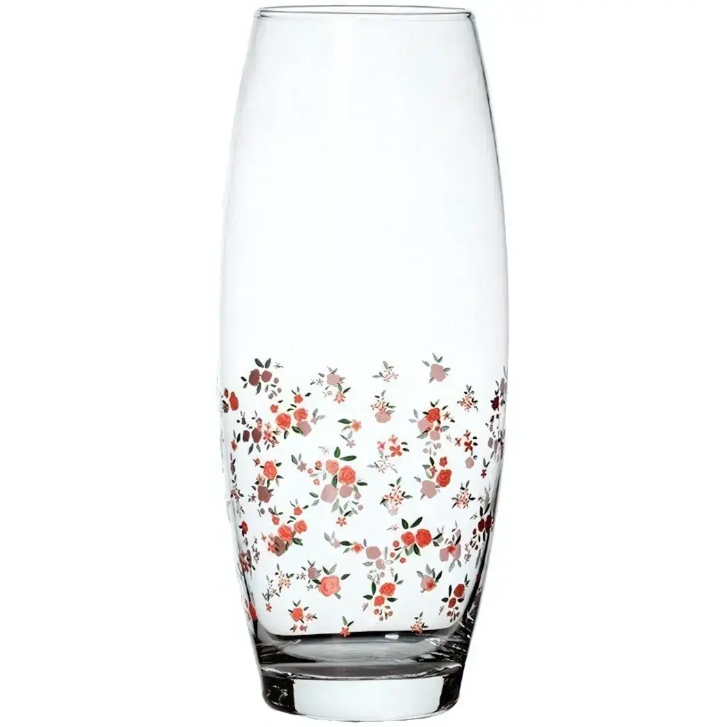 Высота вазы — 26 см, что оптимально для создания выразительных композиций без перегруженности пространства. Изготовлена из прочного натрий-кальциевого стекла, устойчивого к температурным перепадам. Цветочный узор выполнен методом печати, сохраняя прозрачность основного материала.