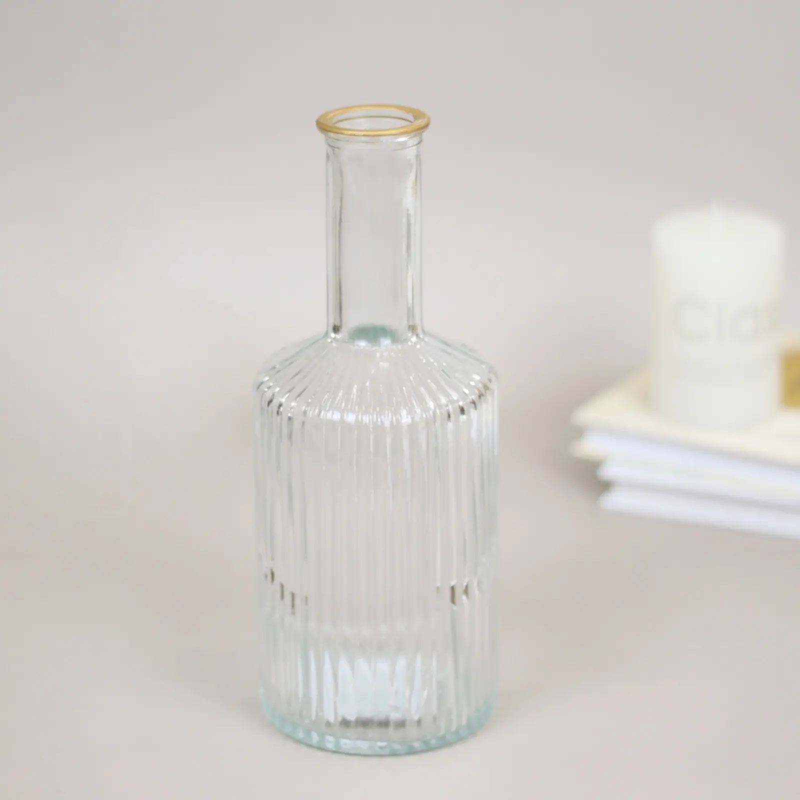 Прозрачная стеклянная ваза "Амфора" с утончённым золотистым кантом на горлышке станет ярким акцентом в интерьере вашего дома. Её цилиндрическая форма с вертикальными рифлёными линиями гармонично сочетается с любым стилем и подчёркивает красоту как пышных букетов, так и одиночных цветов. Такая ваза создаст атмосферу уюта и изысканности в гостиной, спальне или рабочем кабинете.