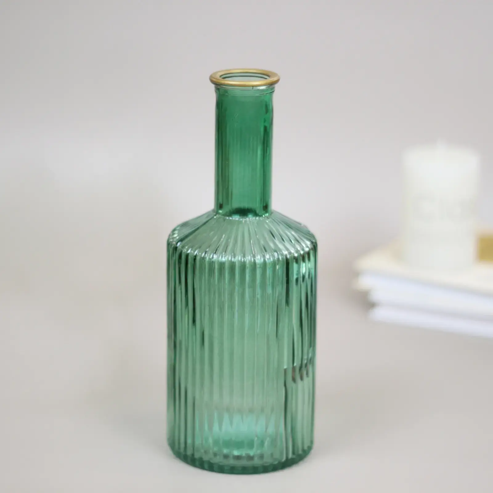 Ваза стеклянная "Амфора" 21,5x8см, зелёная, рифлёная с золотым ободком