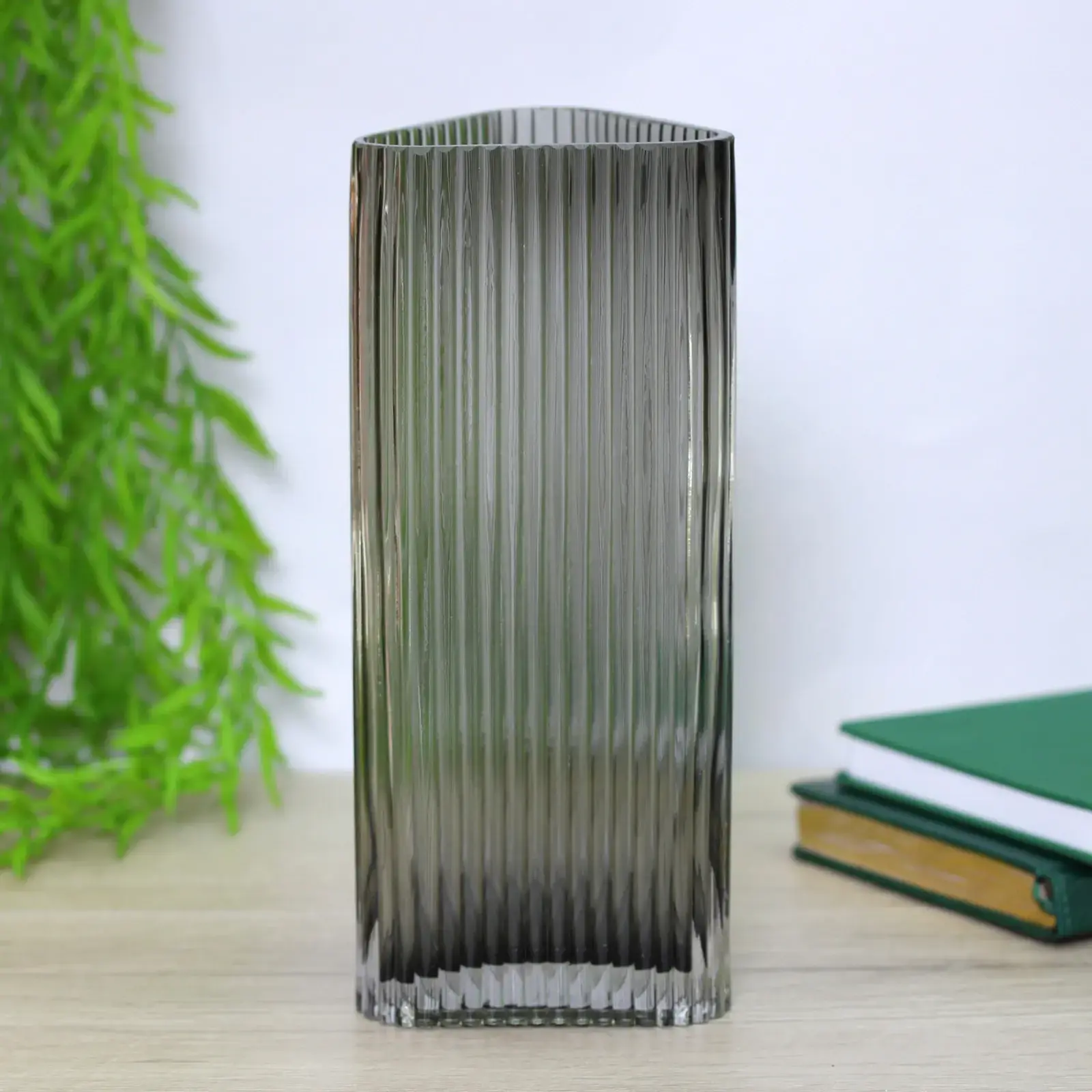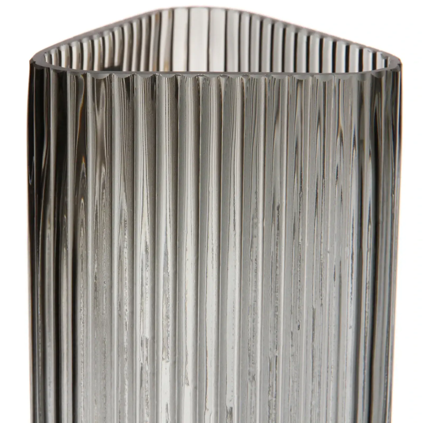 Ваза выполнена из прозрачного стекла с легким серым оттенком, что позволяет ей гармонично вписываться в любой интерьер. Ее треугольная форма и вертикальные рифления придают изделию уникальный вид. Не упустите возможность украсить свой дом стильным аксессуаром, который будет радовать вас и ваших гостей!