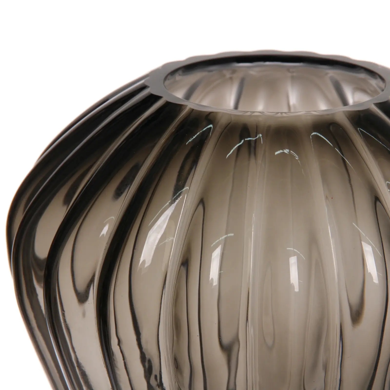 Изготовленная из прочного, прозрачного материала с дымчатым оттенком, ваза легко сочетает с любой цветовой гаммой и интерьером. Вертикальные рельефные ребра придают модели эффектную текстуру и визуальную глубину. Ее размеры 19x25 см позволяют разместить как небольшие, так и крупные цветочные композиции, а плоское основание обеспечивает устойчивость.