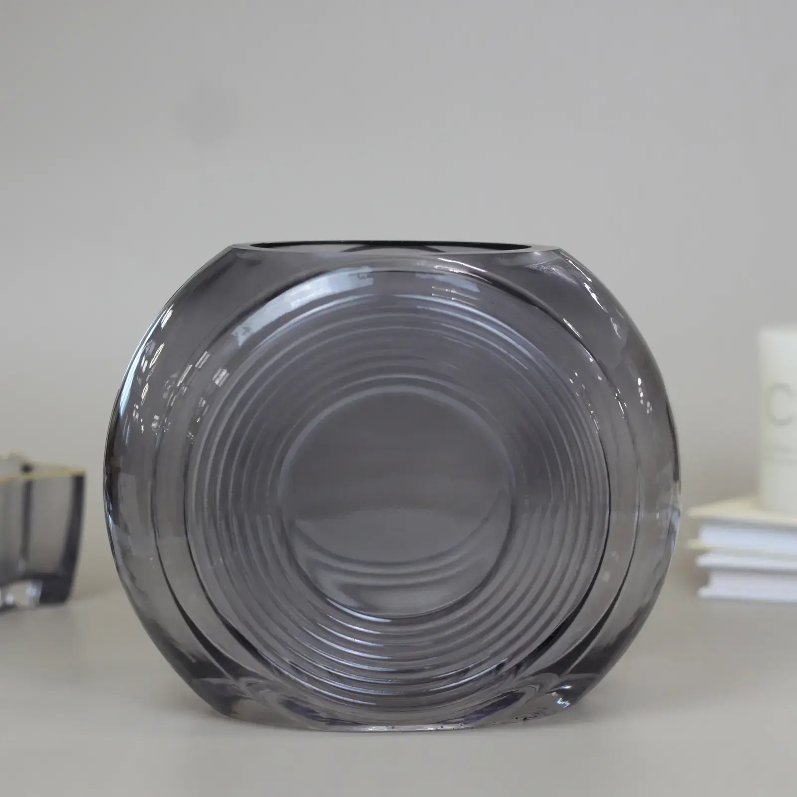 Эта изящная ваза из прозрачного тёмно-серого стекла создаёт атмосферу стиля и гармонии в любом помещении. Её лаконичная форма с округлым корпусом и концентричным рельефом из кольцевых линий делает изделие не только функциональным, но и художественным элементом оформления.