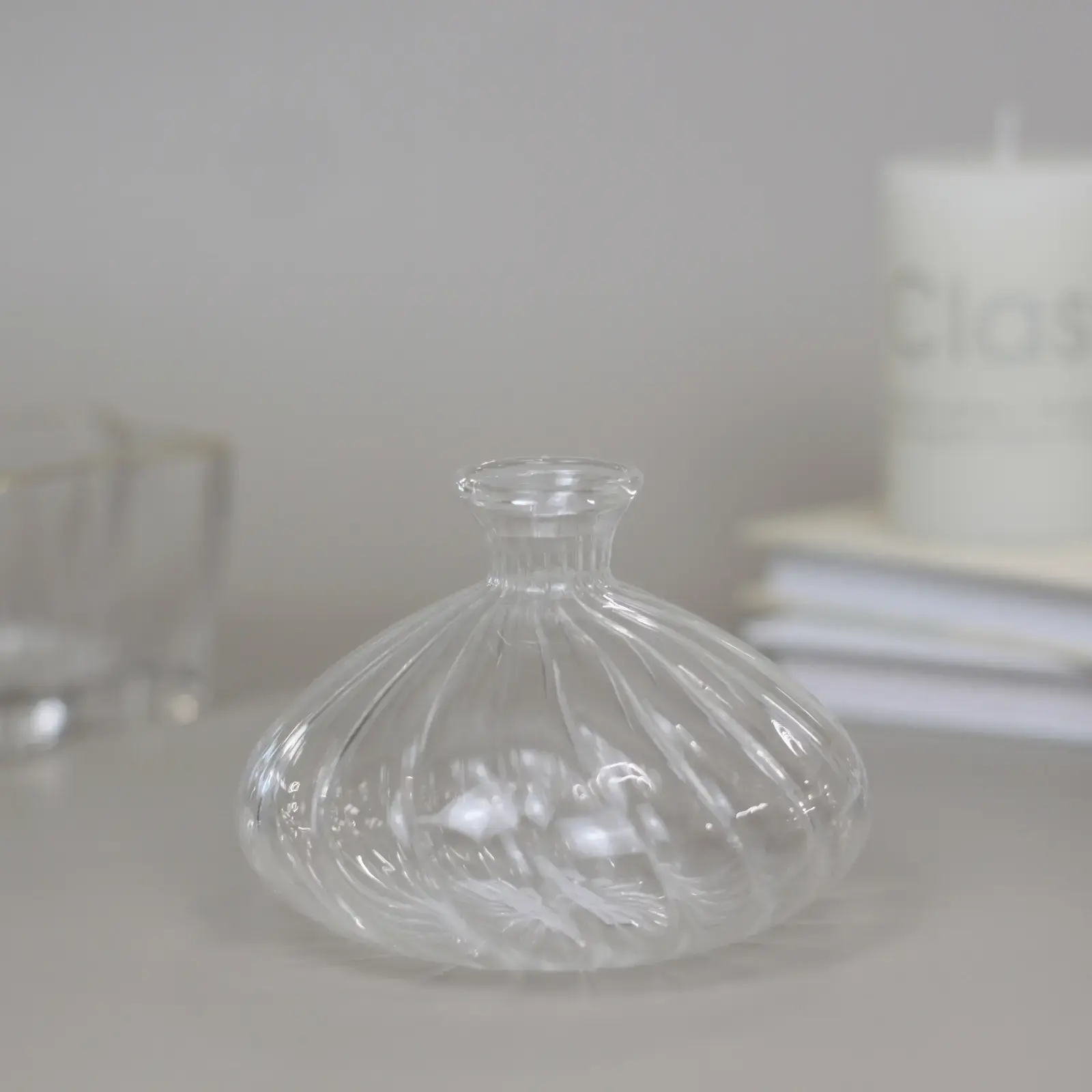 Размер: 10x5 см. Материал: прочное прозрачное стекло с рельефными вертикальными полосами по всей поверхности. Ваза легко моется, устойчива к воздействию влаги и сохраняет свой первоначальный вид на протяжении долгого времени.