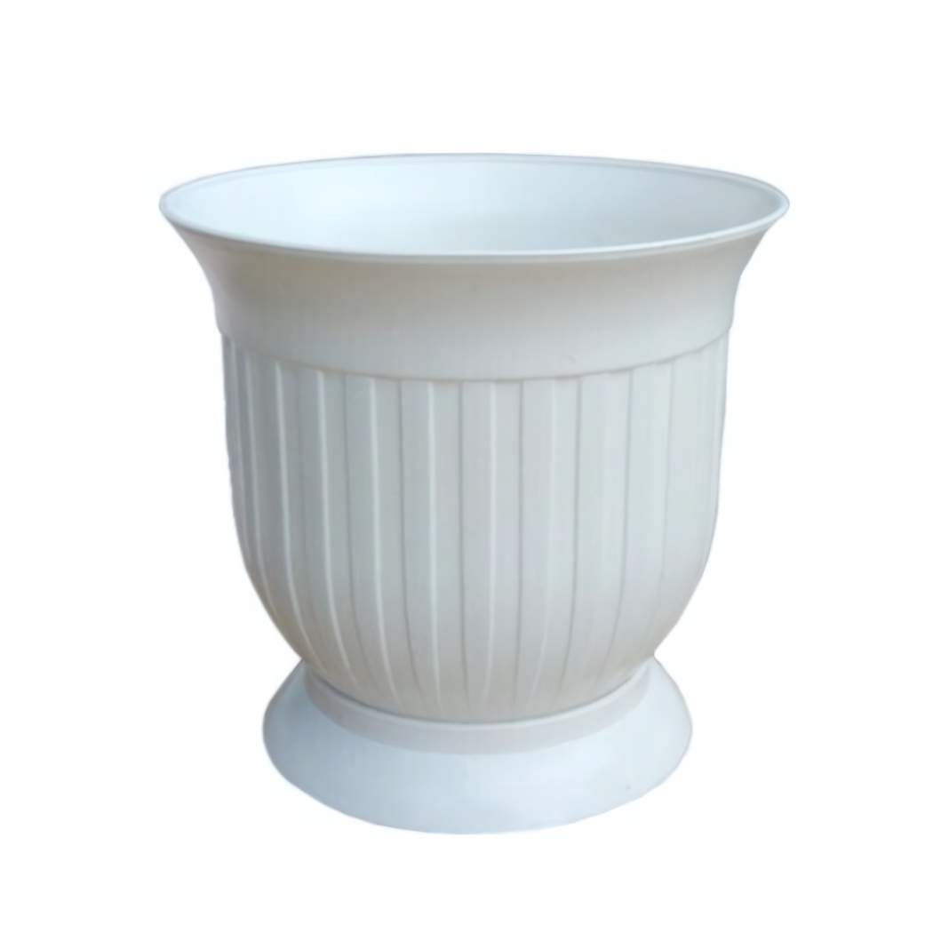 Вазон имеет округлую форму с расширенной верхней частью и сужающейся к основанию, что обеспечивает его стабильность. Вертикальные рифления на поверхности добавляют декоративный элемент, делая его не только функциональным, но и эстетически привлекательным. Размеры вазона идеально подходят для размещения на подоконниках, столах или в саду.