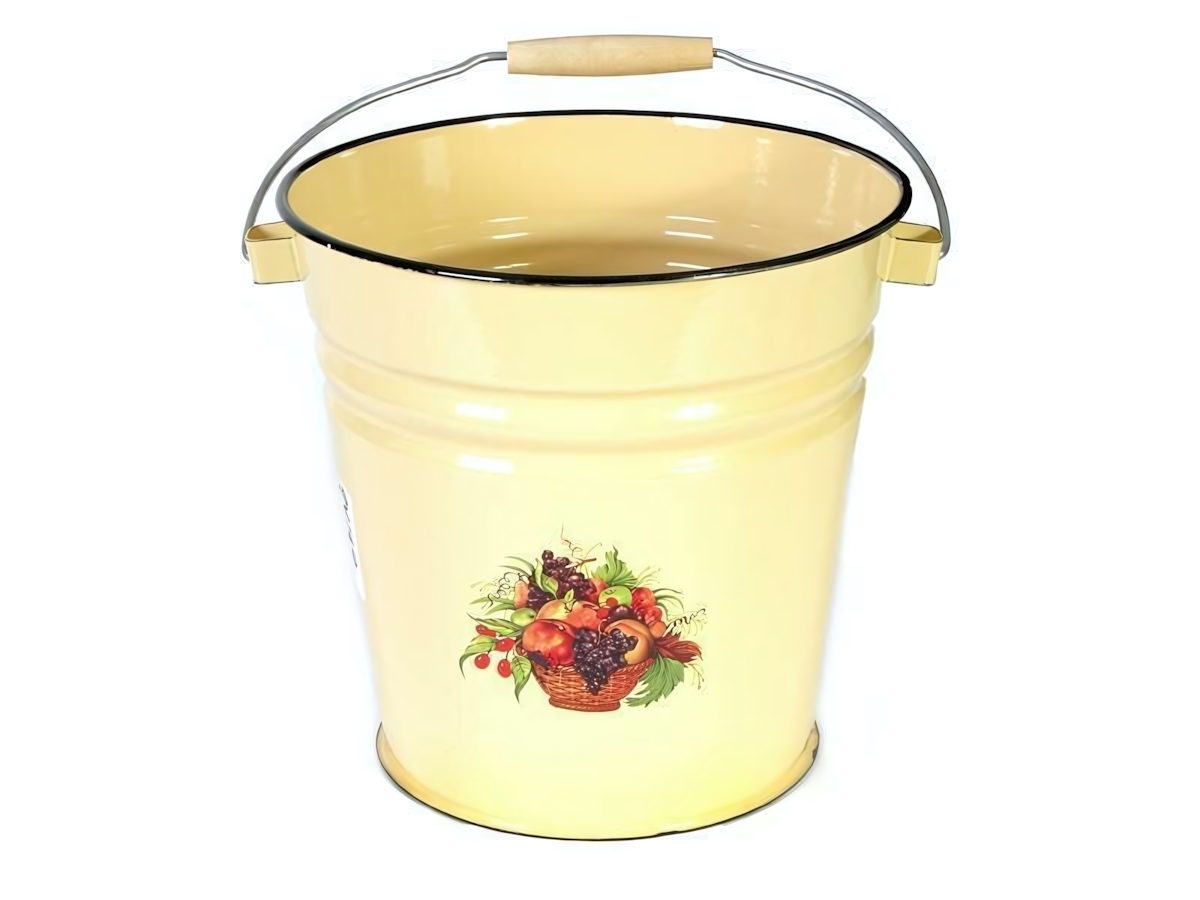 Технические характеристики: объем — 12 литров, материал — сталь, покрытие — эмаль, цвет — желтый с черной окантовкой, ручка — металлическая с деревянной накладкой.