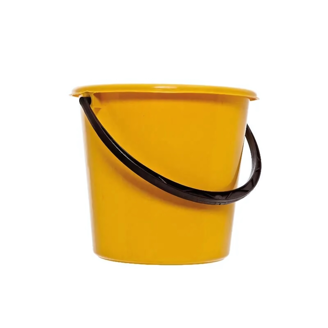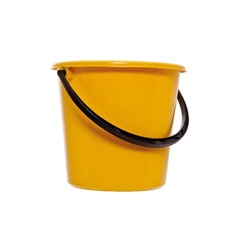 Ведро имеет классическую цилиндрическую форму с небольшим сужением к основанию для устойчивости. По верхнему краю расположен утолщённый бортик, который придаёт дополнительную жёсткость конструкции и удобен для захвата. Ручка тёмного цвета надёжно закреплена по бокам в верхней части. Яркий жёлтый цвет делает ведро заметным и позволяет легко найти его среди других предметов.