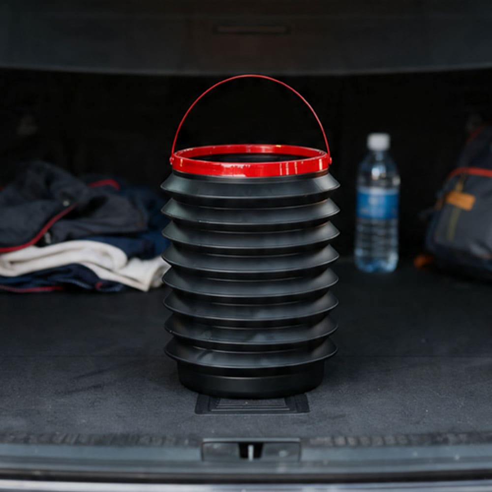 Главная особенность модели — способность трансформироваться. В разложенном виде это вместительное 4-литровое ведро, а в сложенном — плоский диск, который легко поместится в боковую карманную нишу или под сиденье.