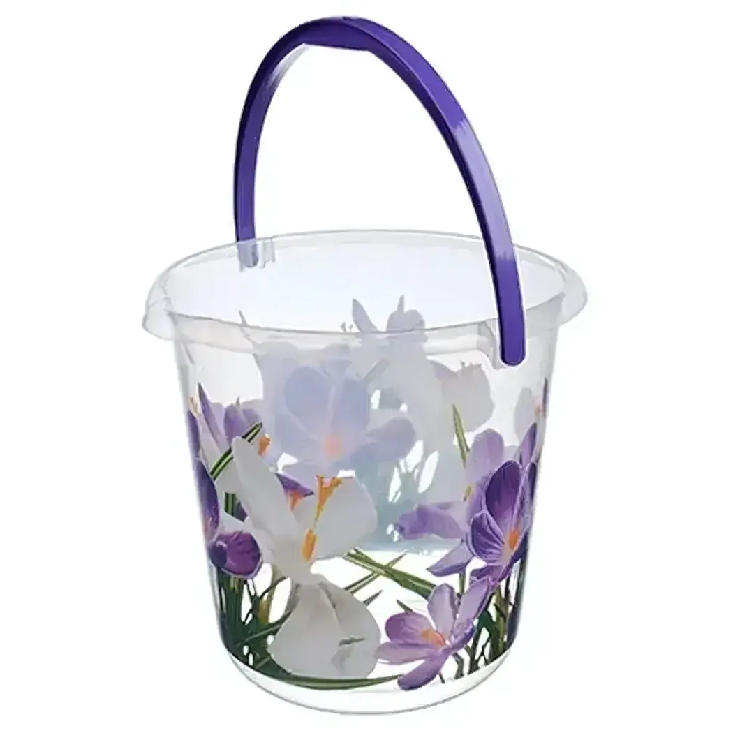 Прозрачное пластиковое ведро «ДЕКО» сочетает практичность и эстетику, создавая эффектную подачу искусственных или живых цветов. Удобная дугообразная ручка фиолетового цвета добавляет яркий акцент, а универсальный дизайн впишется в любой стиль.