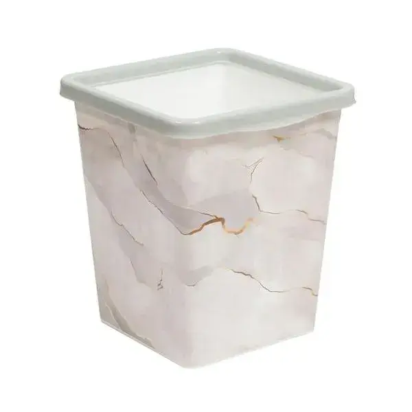 Квадратное ведро для мусора Violet с фиксатором сочетает практичность и современный дизайн. Надежный механизм крепления пакета предотвращает соскальзывание, а декор под белый мрамор легко впишется в интерьер кухни или ванной комнаты.
