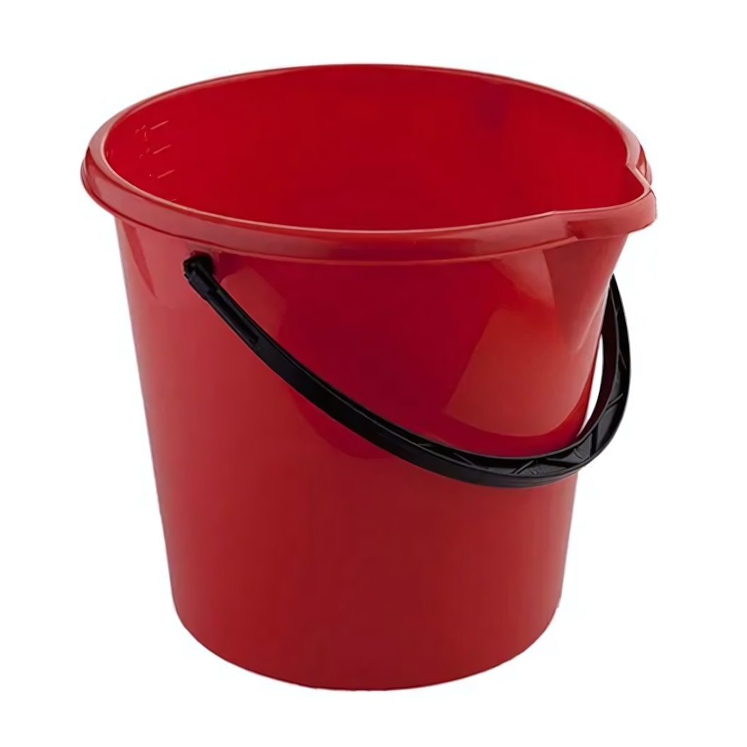 Ведро имеет классическую цилиндрическую форму с утолщенным верхним бортиком, что увеличивает его прочность и долговечность. Глянцевая красная поверхность выглядит аккуратно и ярко. Ручка надежно закреплена в двух точках. Внутренняя поверхность гладкая, с несколькими вертикальными ребрами жесткости, которые могут способствовать дополнительной прочности конструкции.