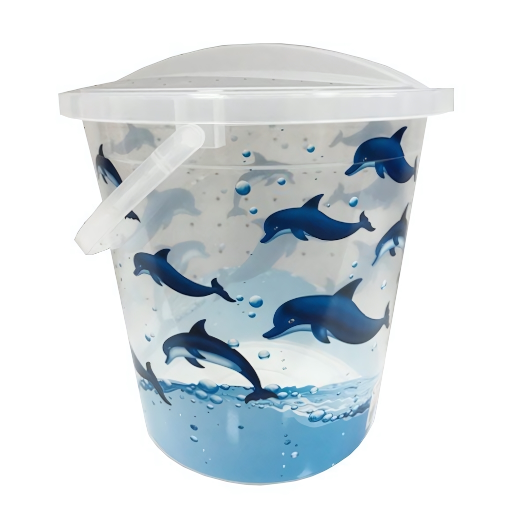 Изделие выполнено из прозрачного пластика с декоративным рисунком в морской тематике. Крышка и ручка изготовлены из полупрозрачного материала светлого оттенка. Ведро рассчитано на объем 14 л и подходит для ежедневного использования в квартире, доме или на даче.