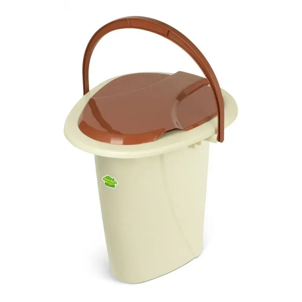 Ведра выполнены в классической цветовой гамме: кремовый корпус сочетается с коричневой крышкой. Материал изделий — ударопрочный полипропилен, устойчивый к деформации и УФ-излучению. Комплект из 6 одинаковых емкостей позволяет организовать систему раздельного сбора отходов или использовать одновременно в разных зонах участка.