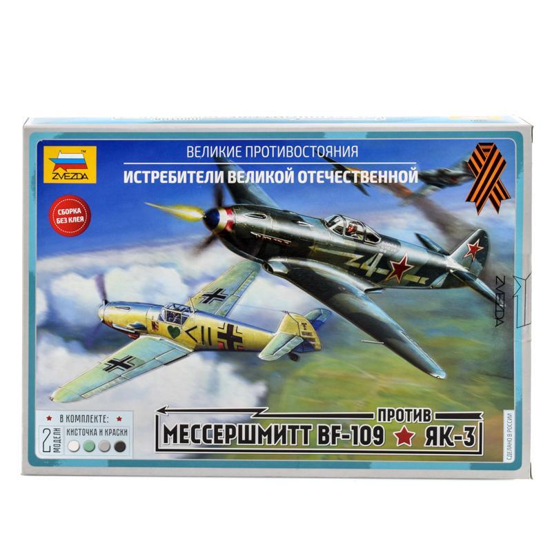 Сборная модель 'Великие противостояния' перенесет вас в эпоху Великой Отечественной войны. В наборе представлены два легендарных истребителя: немецкий Мессершмитт Bf-109 и советский Як-3.