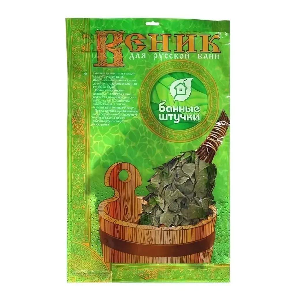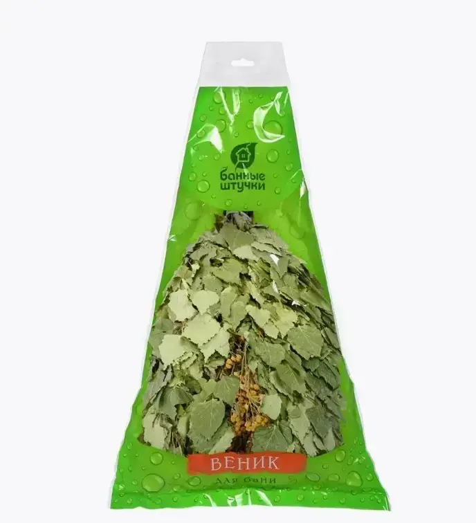 Веник упакован в яркую упаковку, которая не только защищает его, но и позволяет видеть его натуральный вид. Упаковка имеет треугольную форму с прозрачным верхом, что делает его удобным для хранения и использования. Этот веник станет отличным подарком для любителей бани и здоровья.