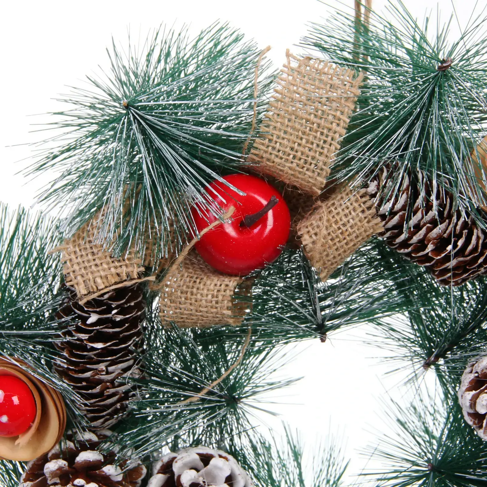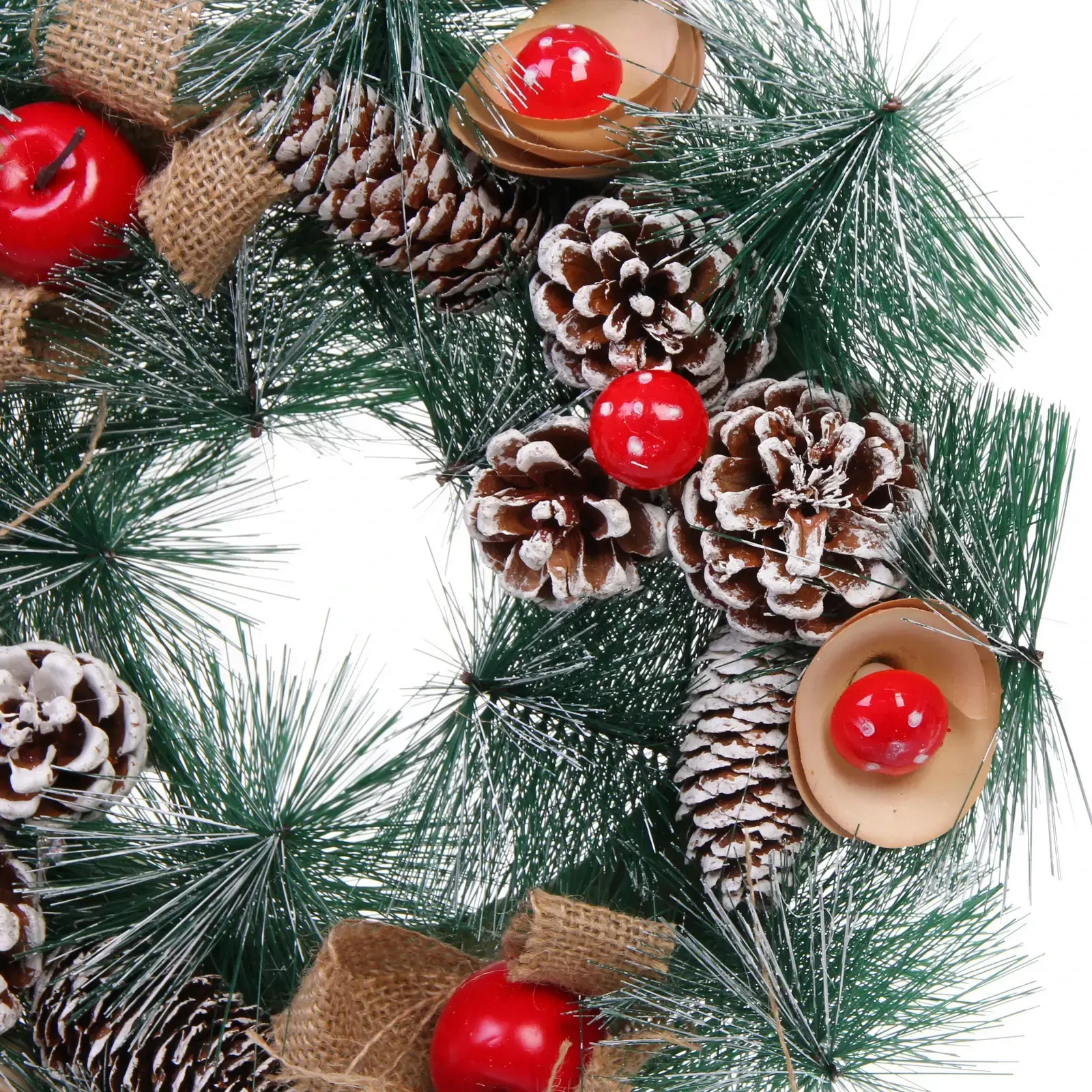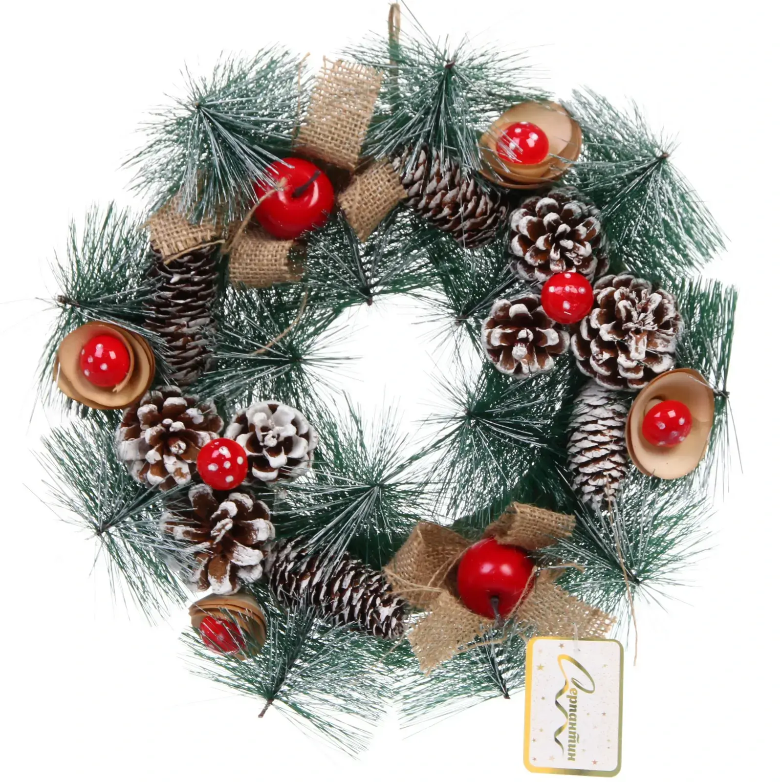 Размер венка составляет 30 см в диаметре, что делает его универсальным для различных стилей оформления. Он украшен шишками, окрашенными в коричневый цвет, и яркими ягодами, что создает контраст с зелеными ветками. Венок также дополнен элементами из мешковины, что придаёт ему особый шарм и текстуру.