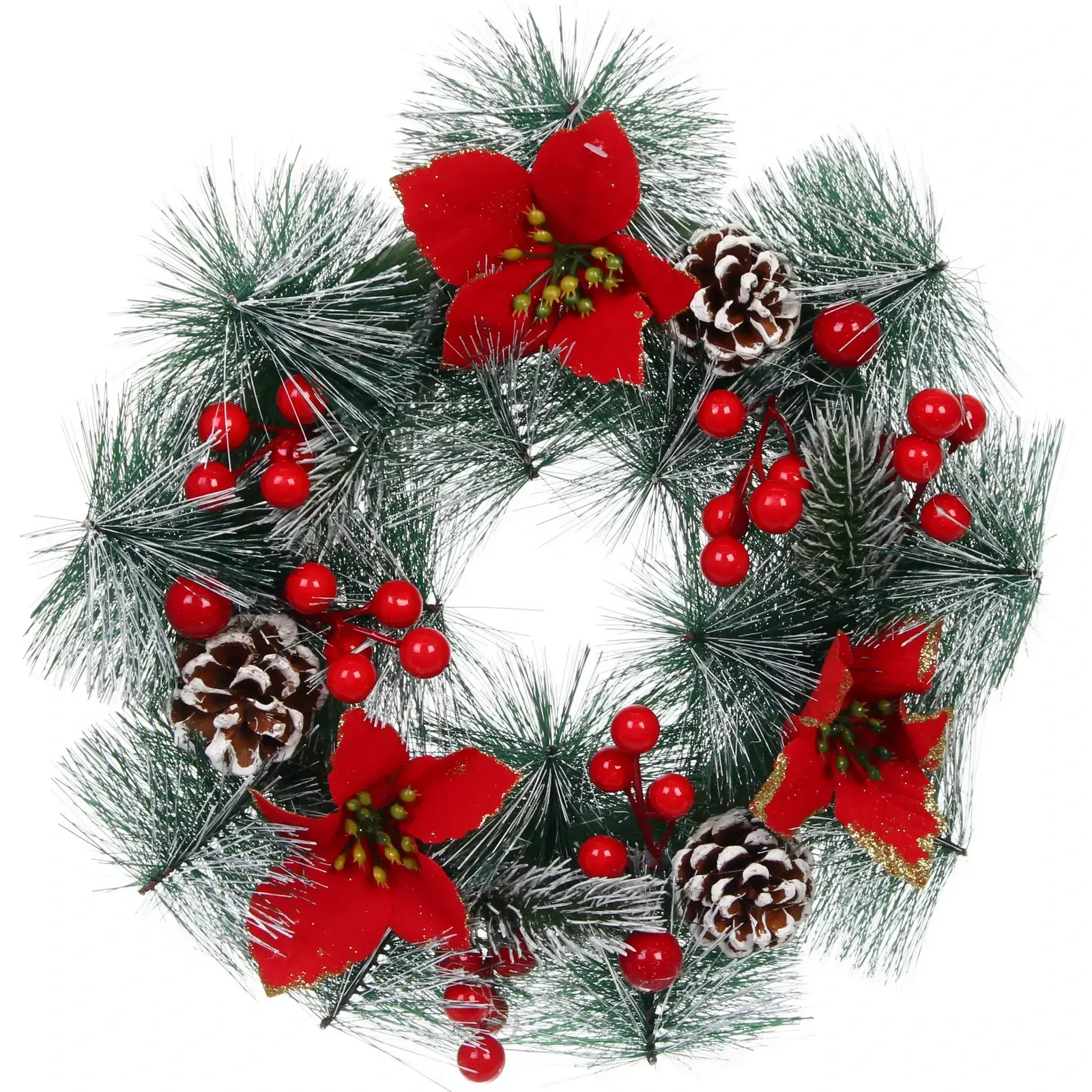 Венок выполнен из высококачественных материалов: металлического каркаса и пластиковых иголок, имитирующих хвойные деревья. Он украшен искусственными цветами, ягодами и шишками, что делает его не только красивым, но и долговечным. Венок диаметром 30 см легко разместить в любом интерьере, а его яркие цвета будут радовать глаз на протяжении всего зимнего сезона.