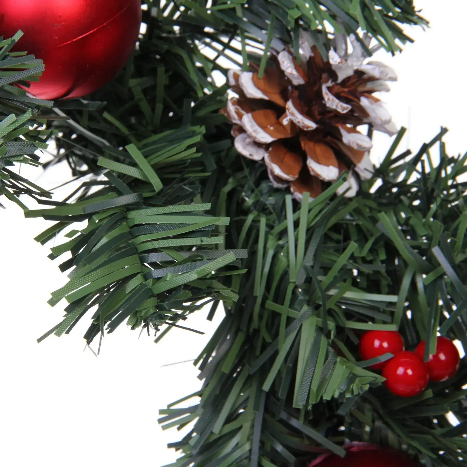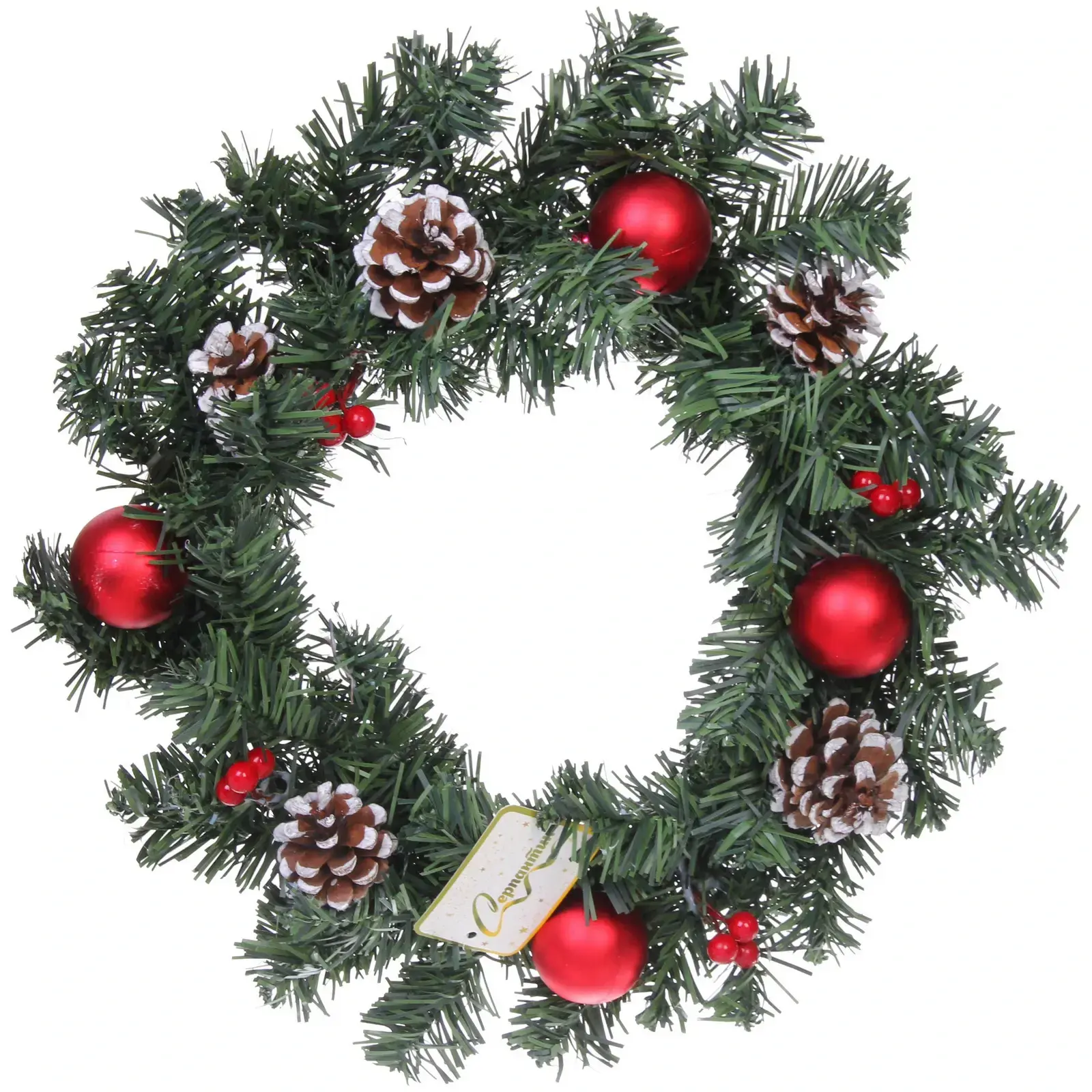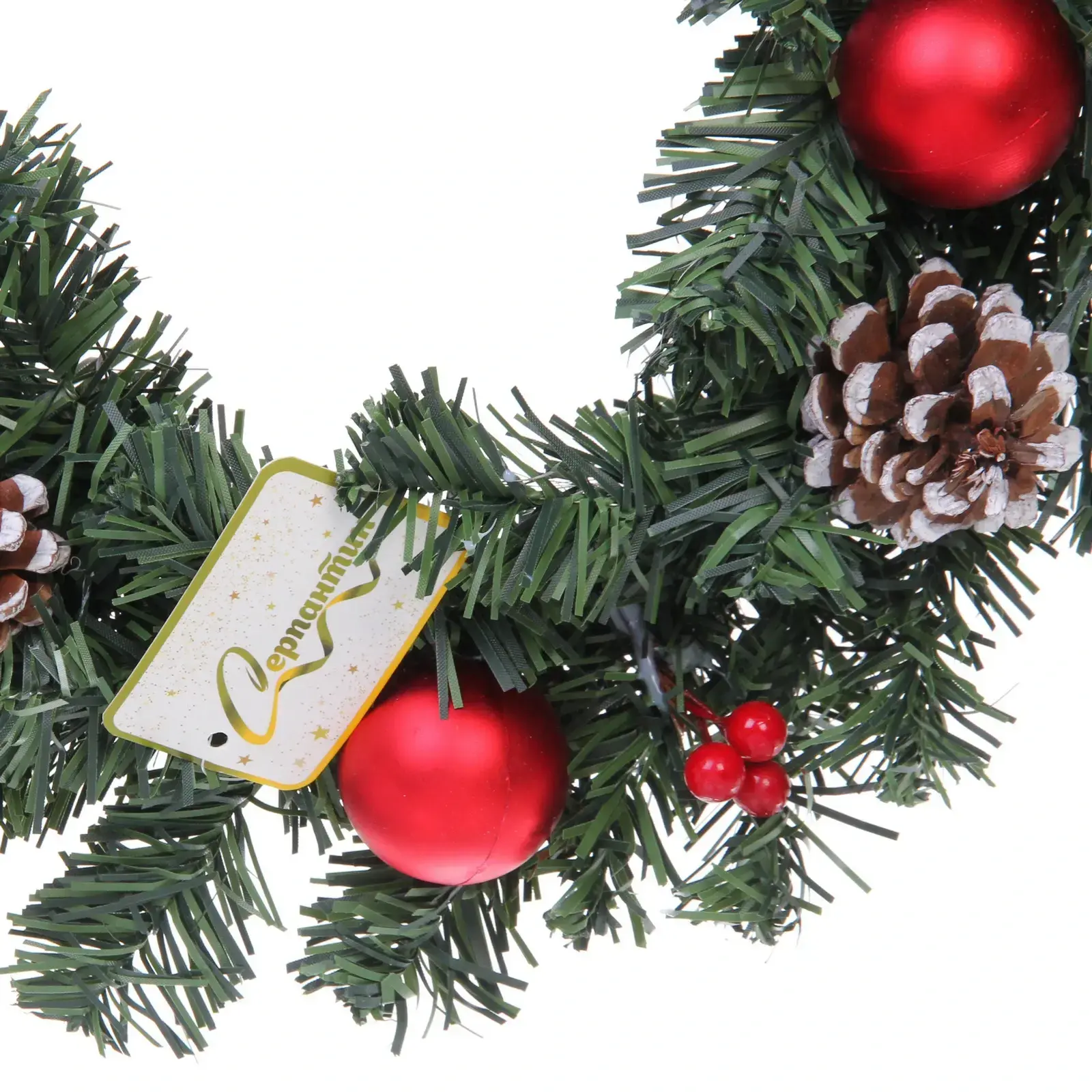 Размер венка составляет 30 см в диаметре, что делает его компактным и удобным для размещения в любом уголке вашего дома. Основной цвет венка – зеленый, что создает эффект свежести и натуральности. Красные шарики и шишки добавляют яркие акценты, а мелкие ягодки придают венку завершенный вид.
