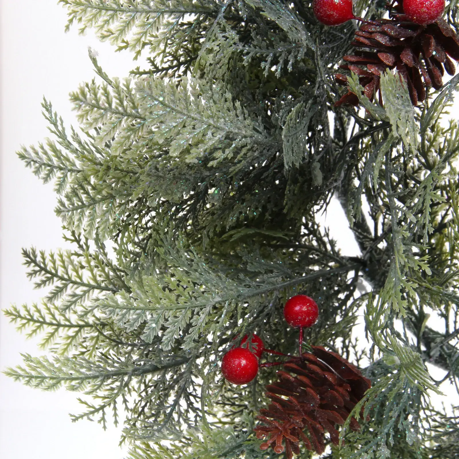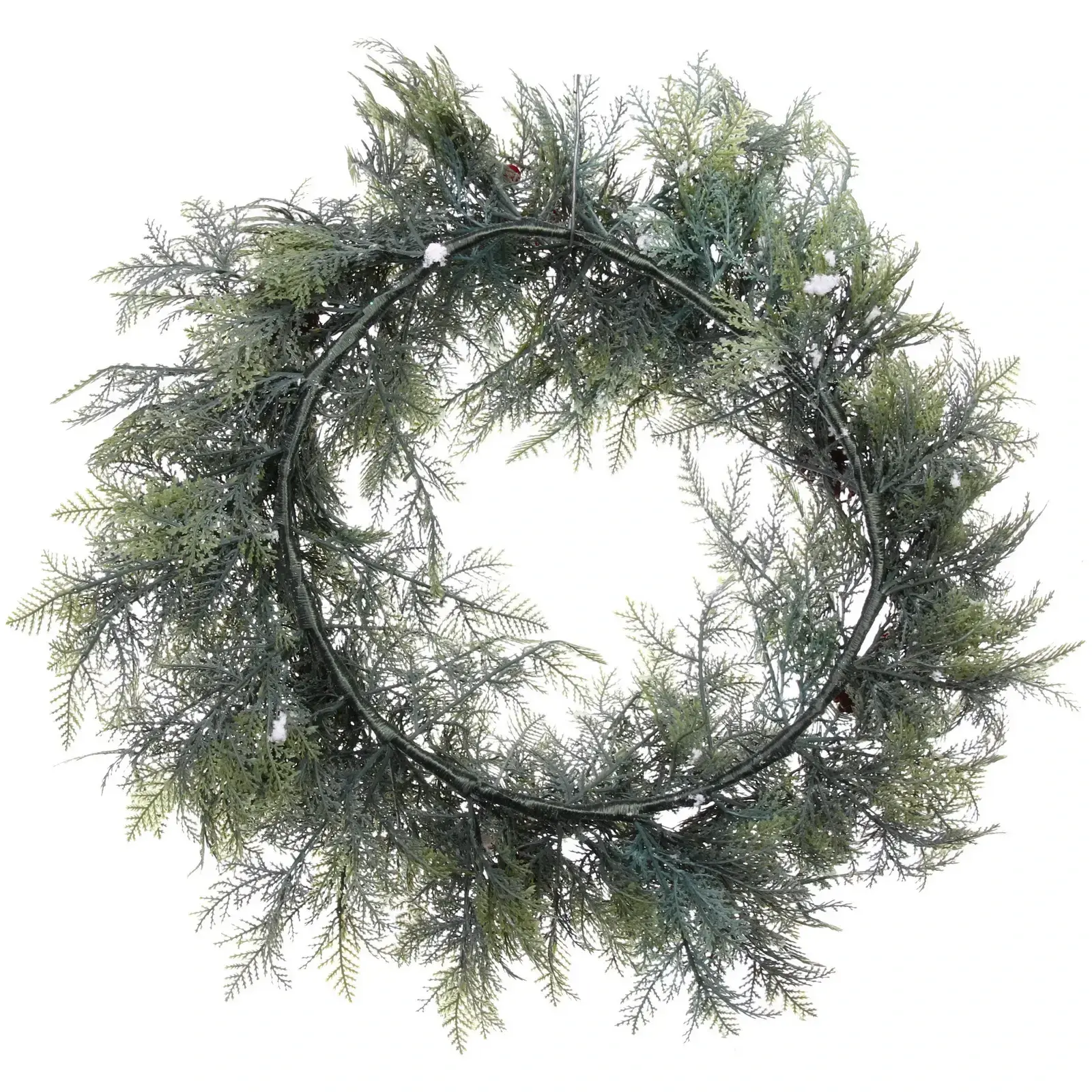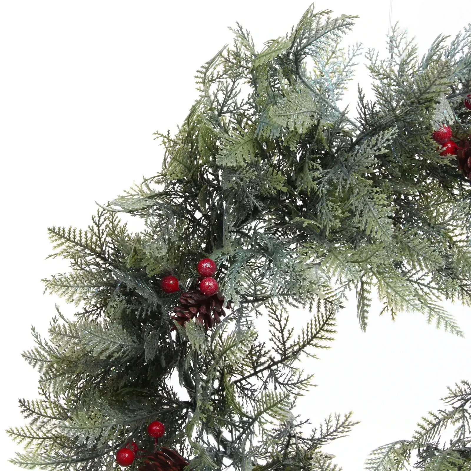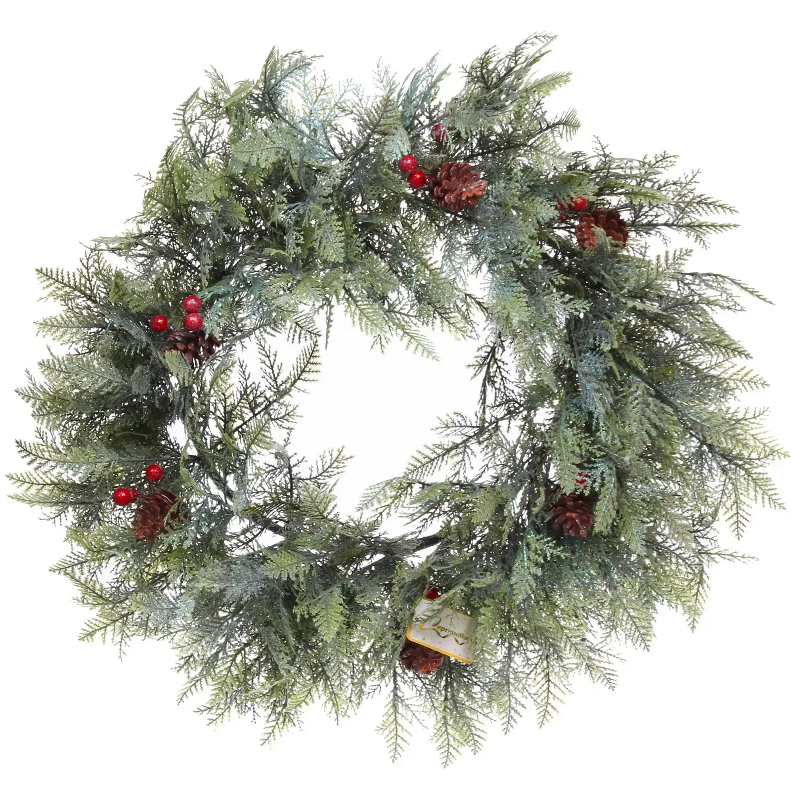 Венок имеет диаметр 50 см и выполнен из прочного литого ПВХ, что делает его легким и удобным в использовании. Декоративные элементы, такие как шишки и ягоды, добавляют яркие акценты и делают венок более объемным и привлекательным. Этот венок станет отличным дополнением к вашему новогоднему декору и поможет создать атмосферу уюта и праздника.
