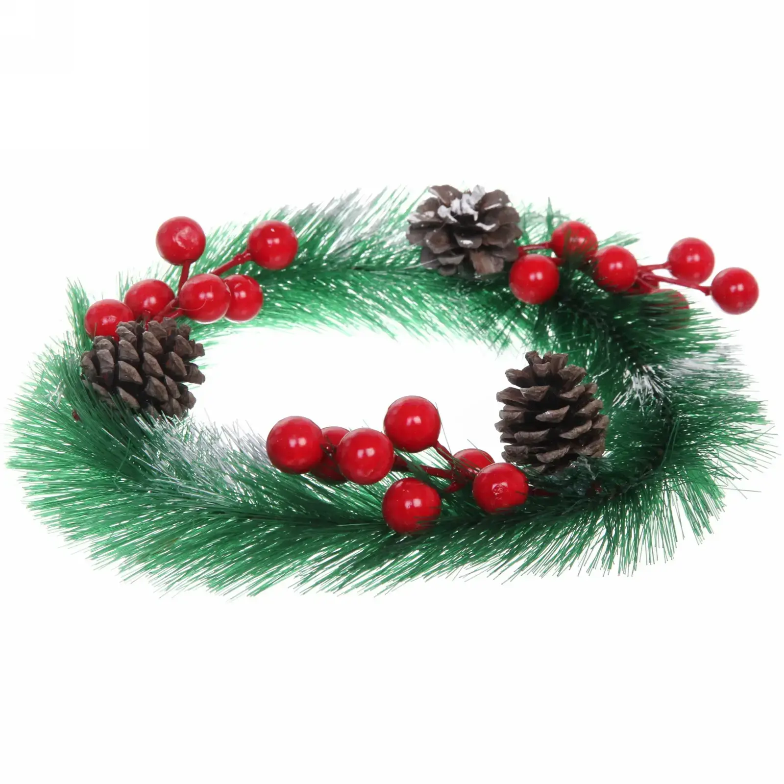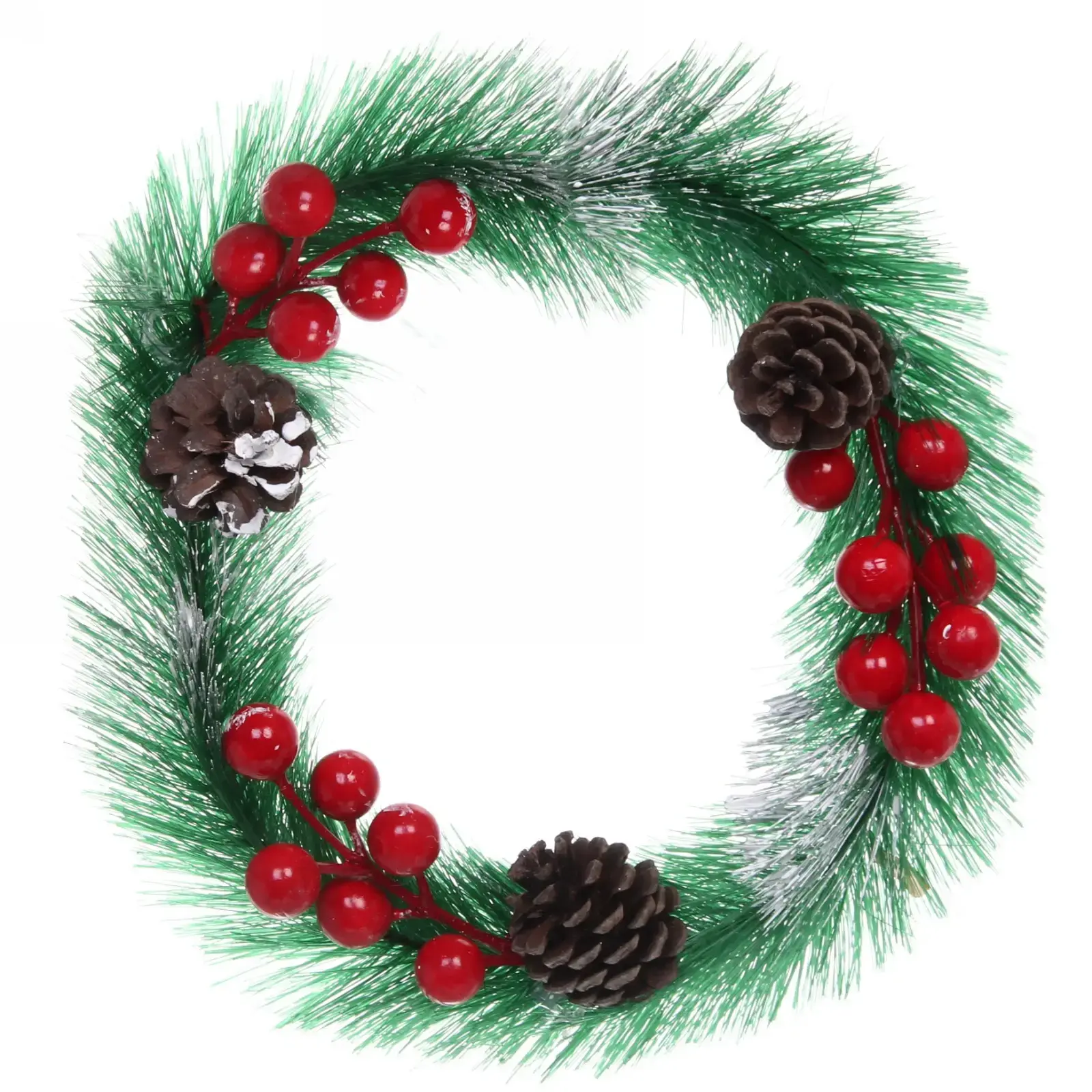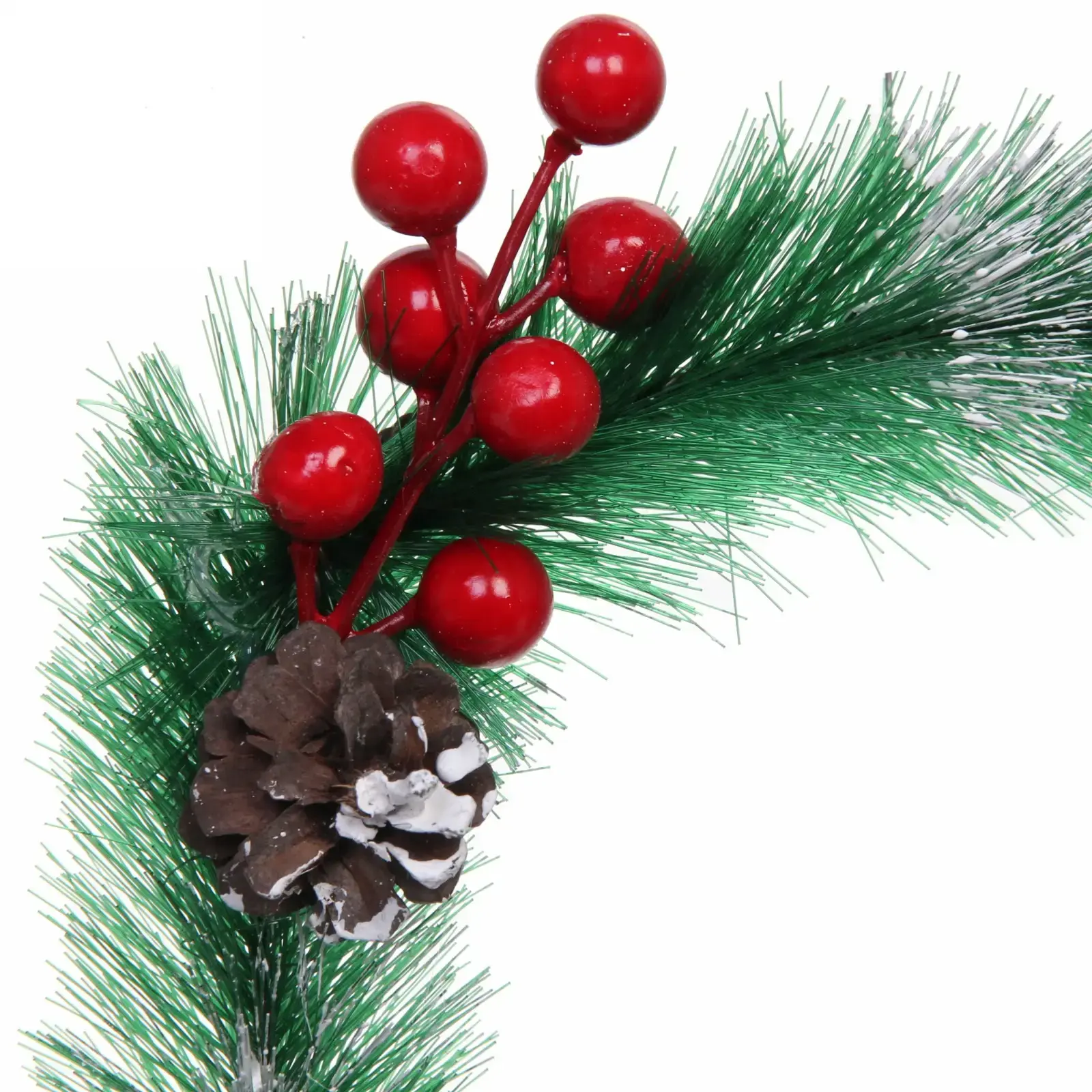 - Украшен натуральными шишками и красными пластиковыми ягодами, что придаёт ему праздничный вид.