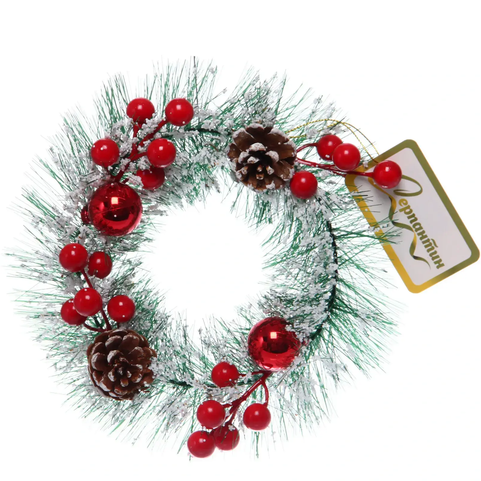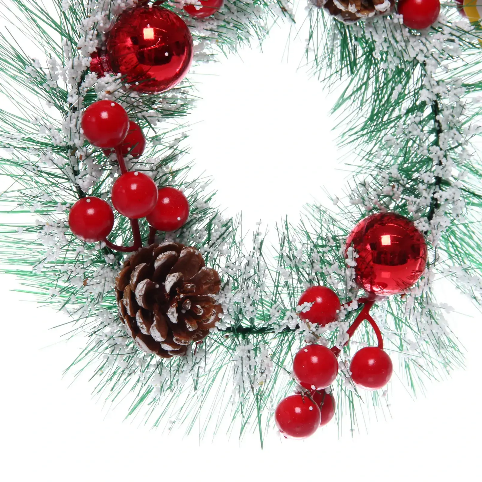 Венок украшен искусственными ветками, которые имитируют еловые иголки, и декорирован красными пластиковыми шарами и ягодами, а также натуральной шишкой. Элементы, создающие эффект свежести и праздника, делают его привлекательным и стильным. Яркие цвета и блестящие детали привлекут внимание и создадут праздничное настроение.