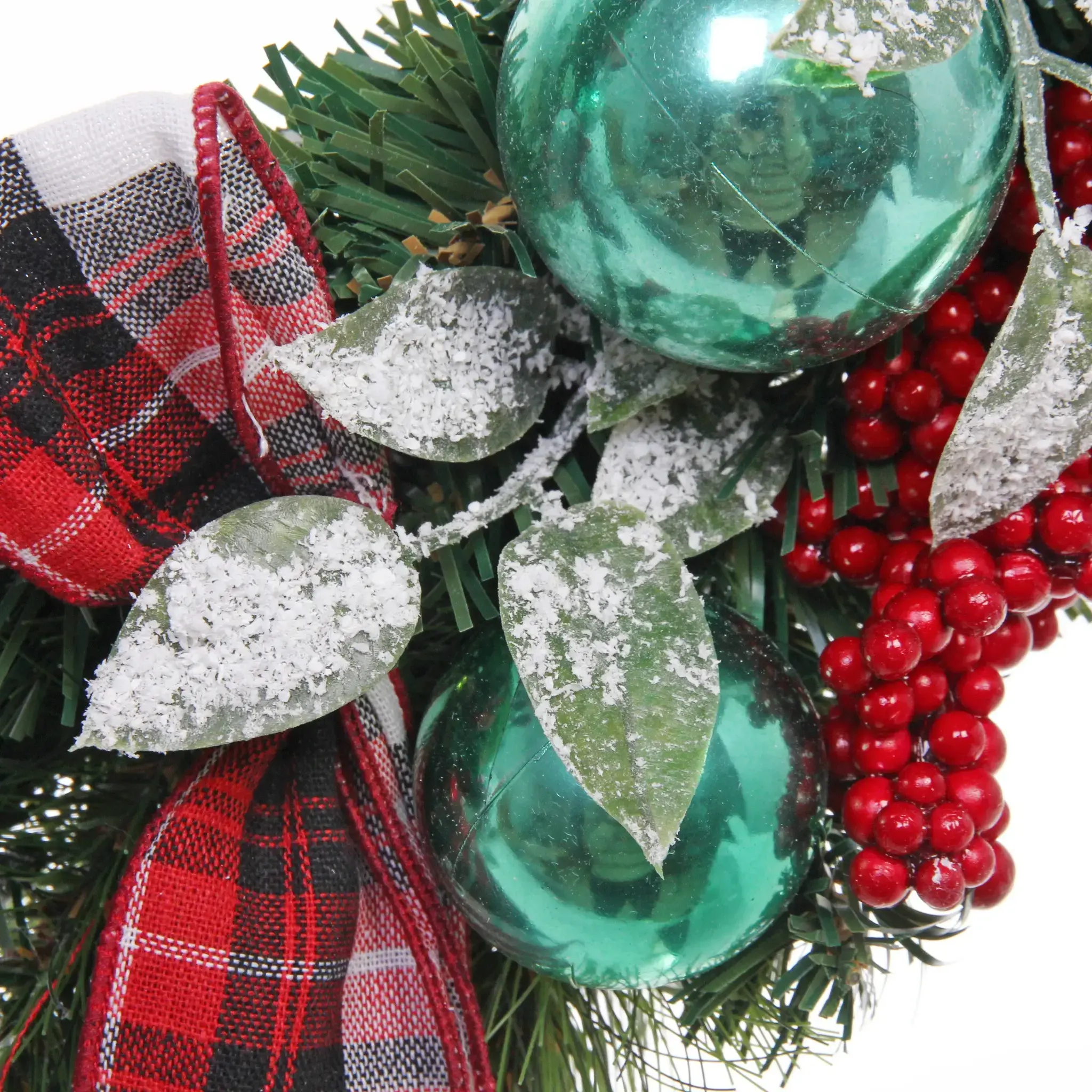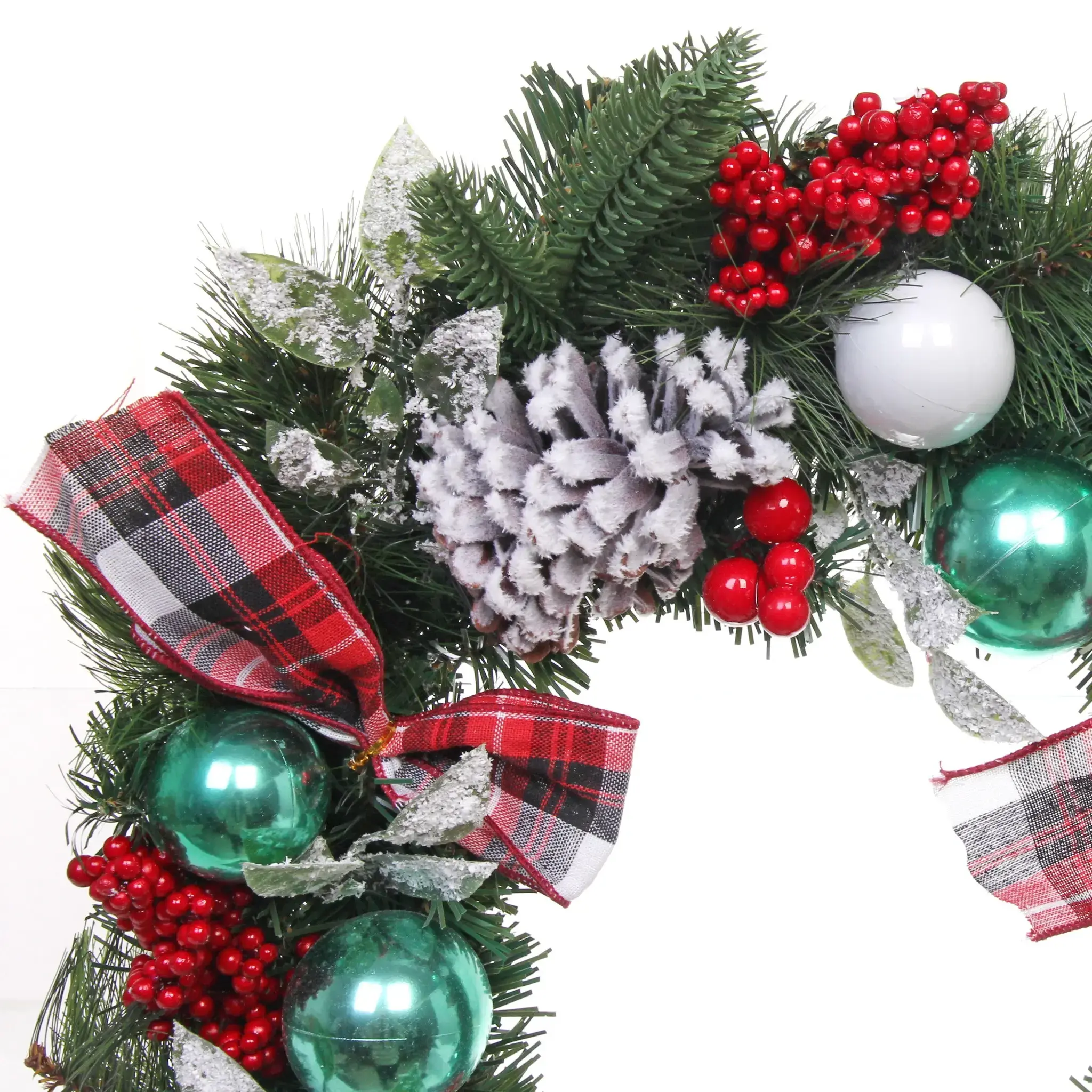 - Декоративные элементы: шишки, красные ягоды, металлические шары