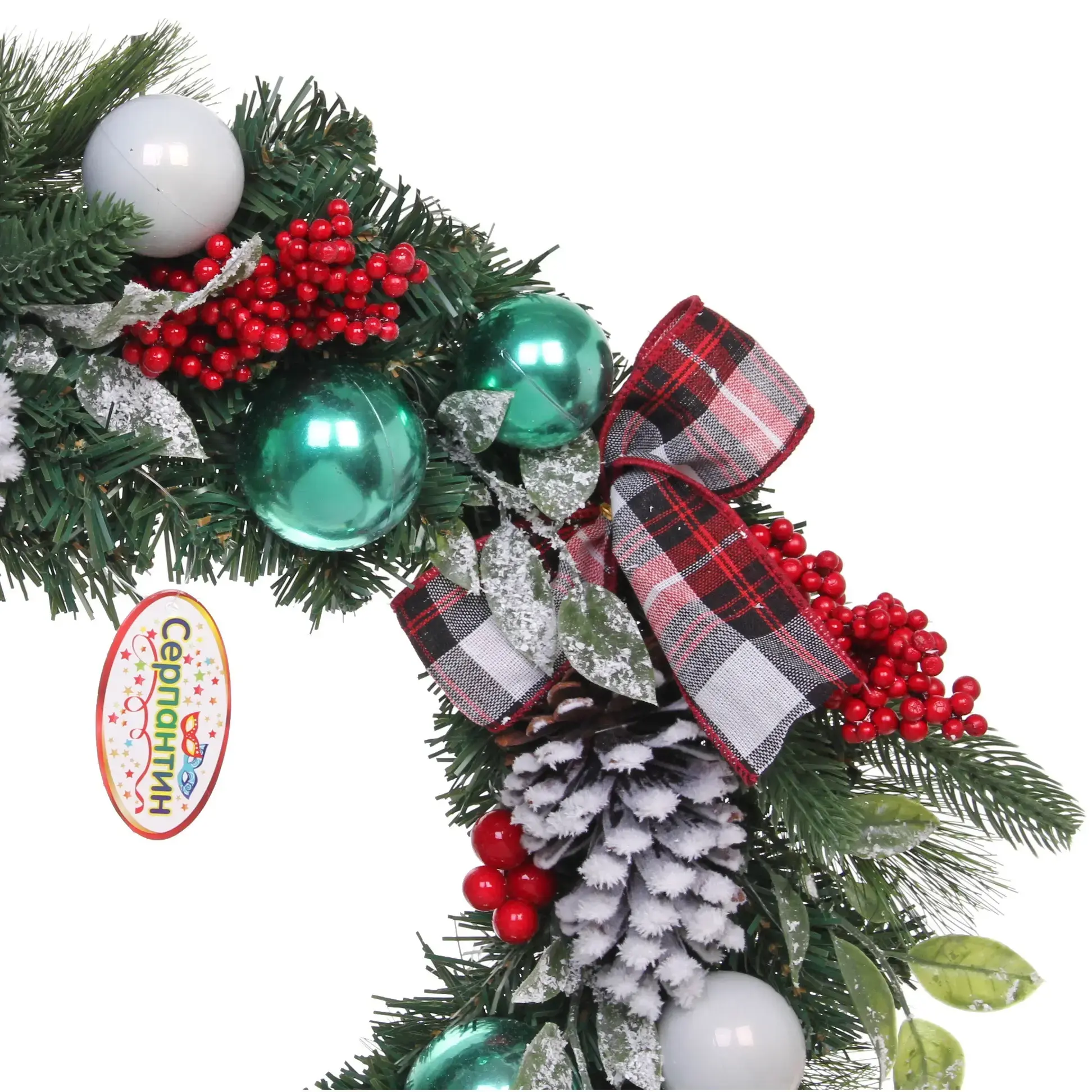 Венок можно повесить на входную дверь, стену или использовать как часть праздничной композиции в интерьере. Он подходит для украшения дома, офиса или магазина.