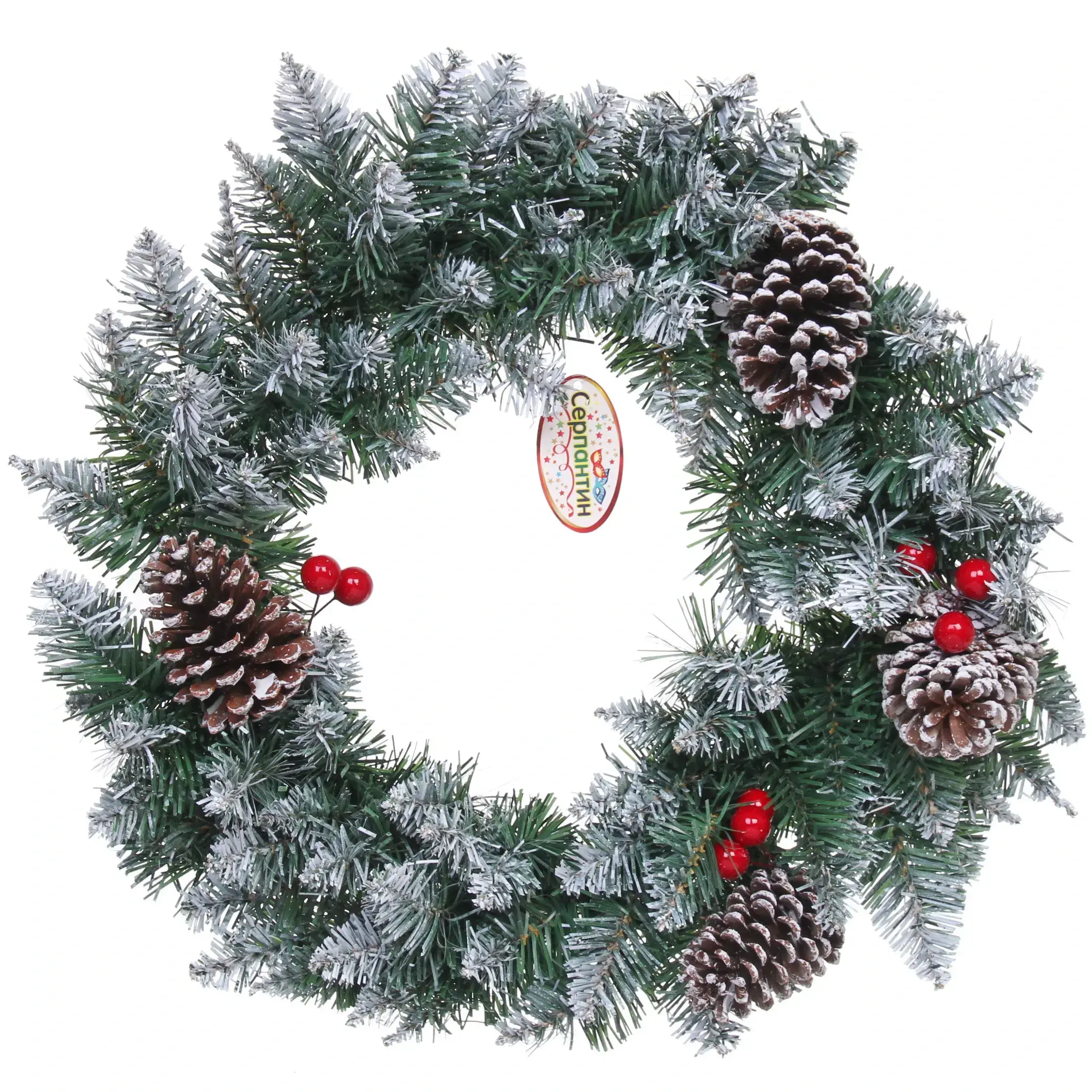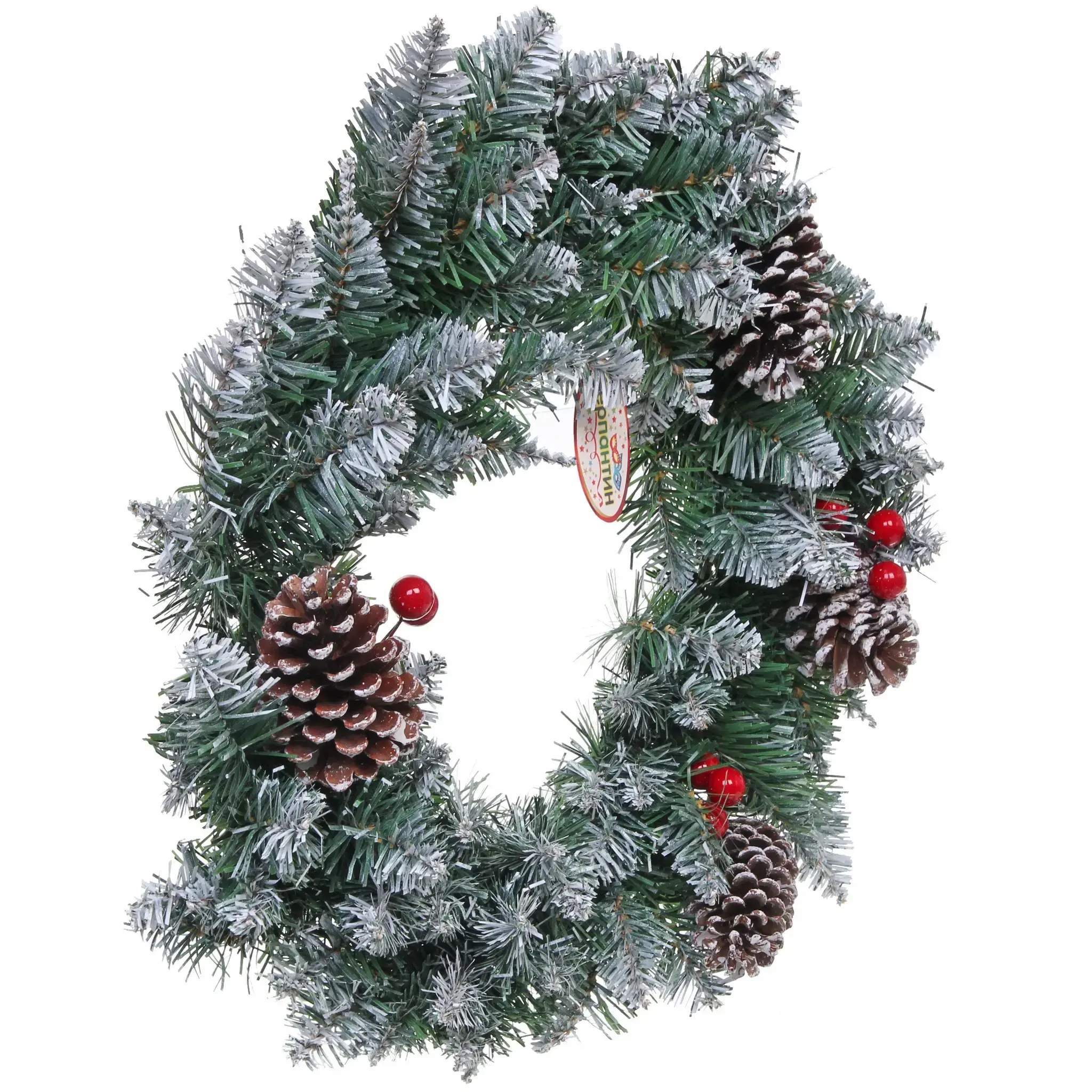 Венок изготовлен из высококачественного ПВХ и металла, что гарантирует его долговечность. Основной цвет венка – насыщенный зеленый, с белыми участками, имитирующими снег, что придает ему зимний вид. Размер венка составляет 50 см в диаметре, что делает его заметным элементом декора.
