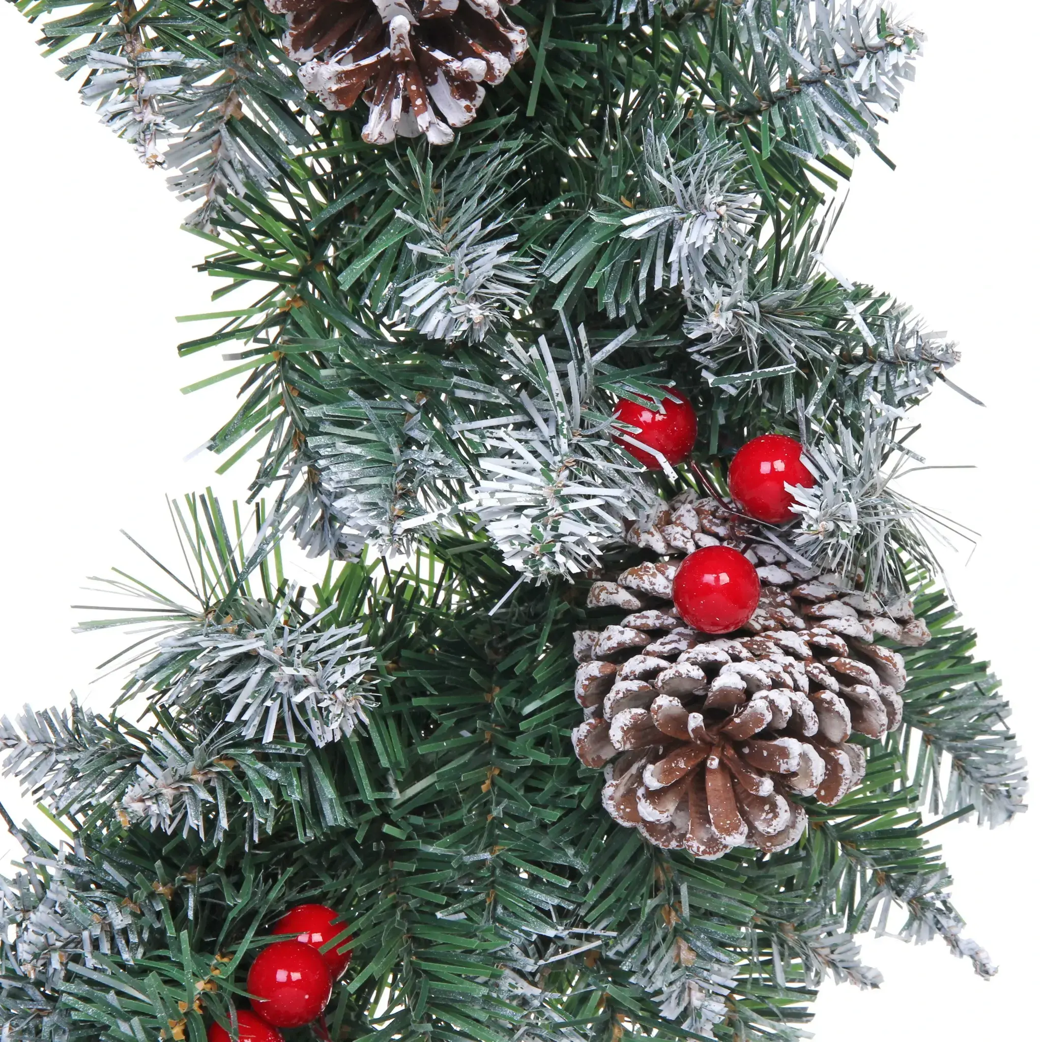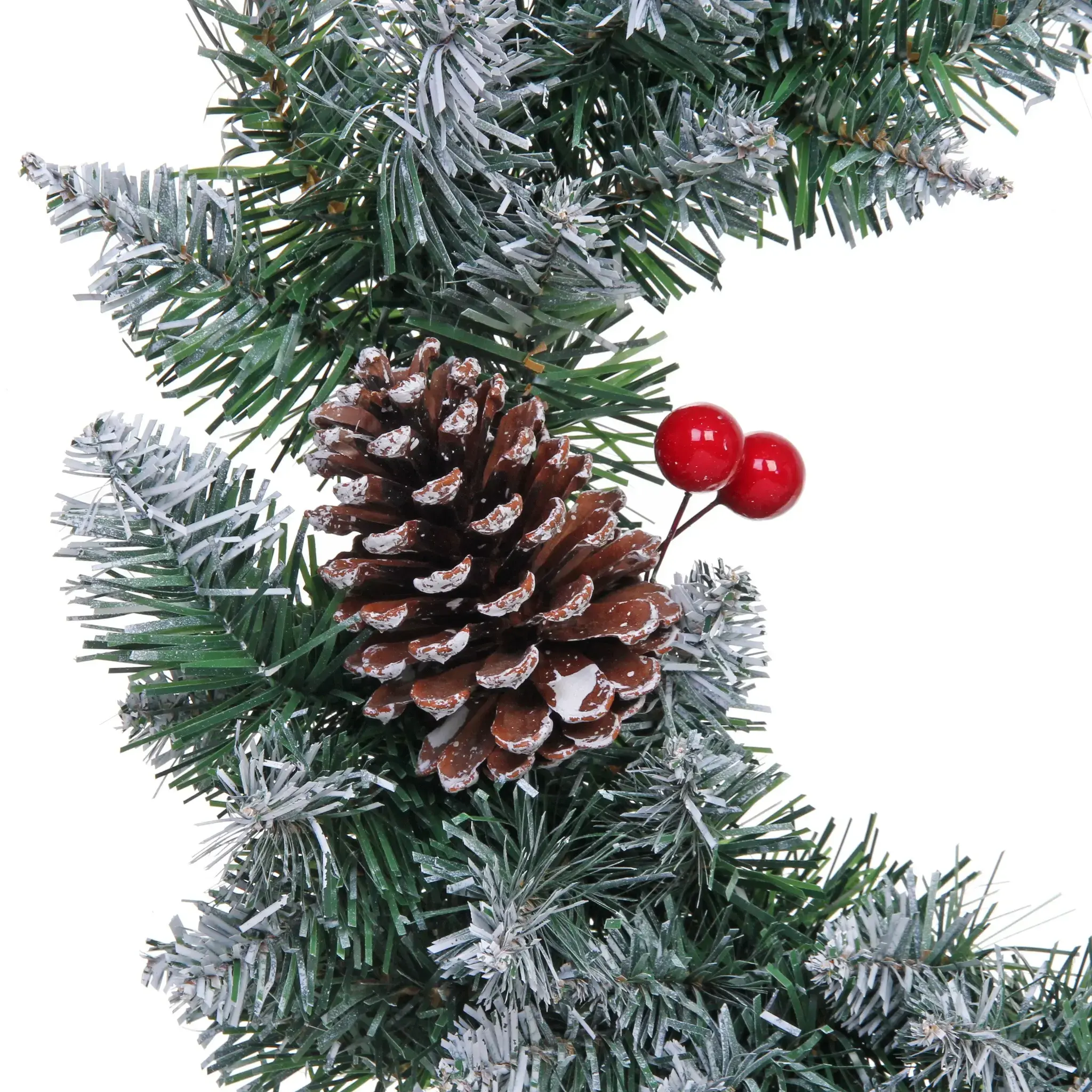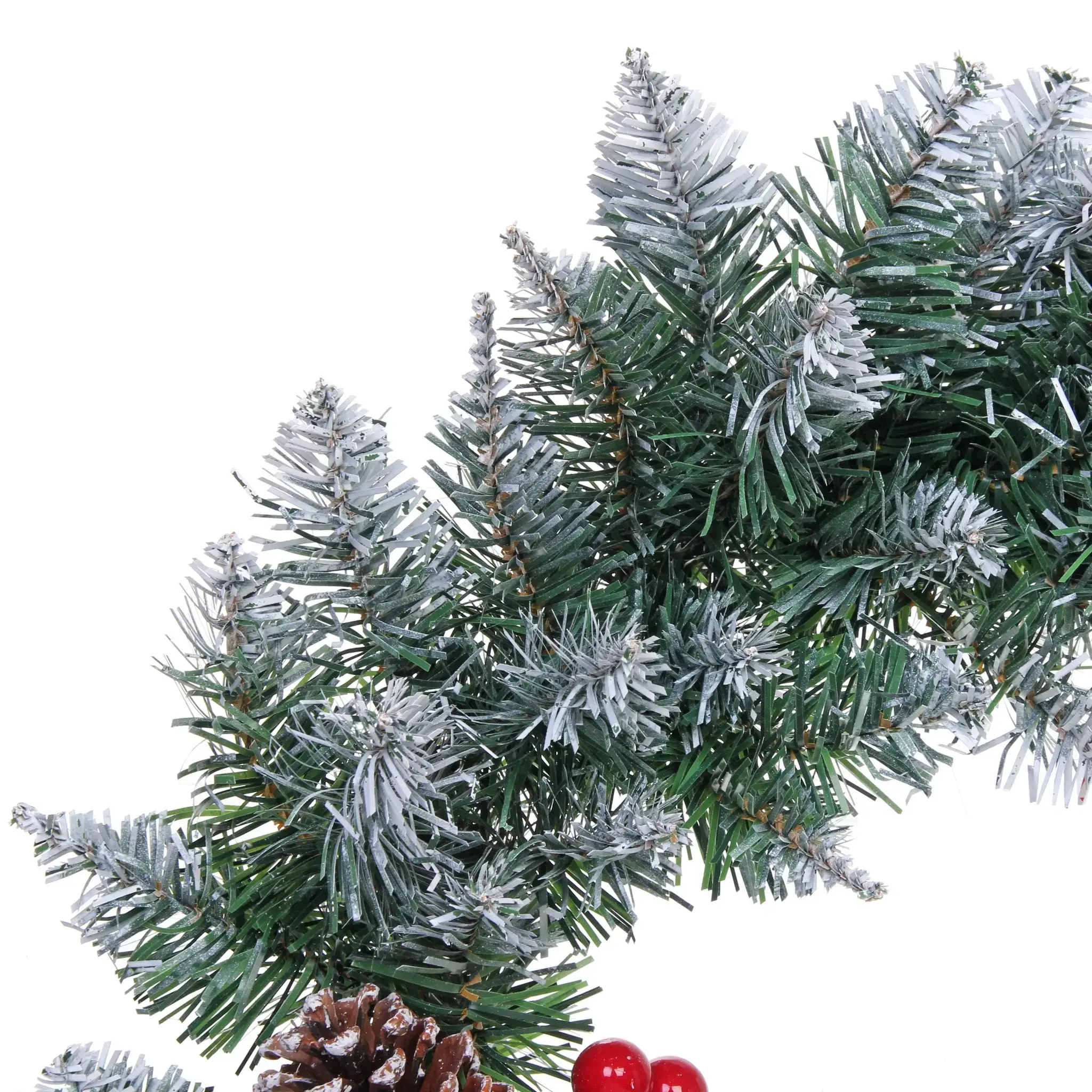 - Декоративные элементы: натуральные коричневые шишки и яркие красные ягоды, которые добавляют контраст и визуальную привлекательность.