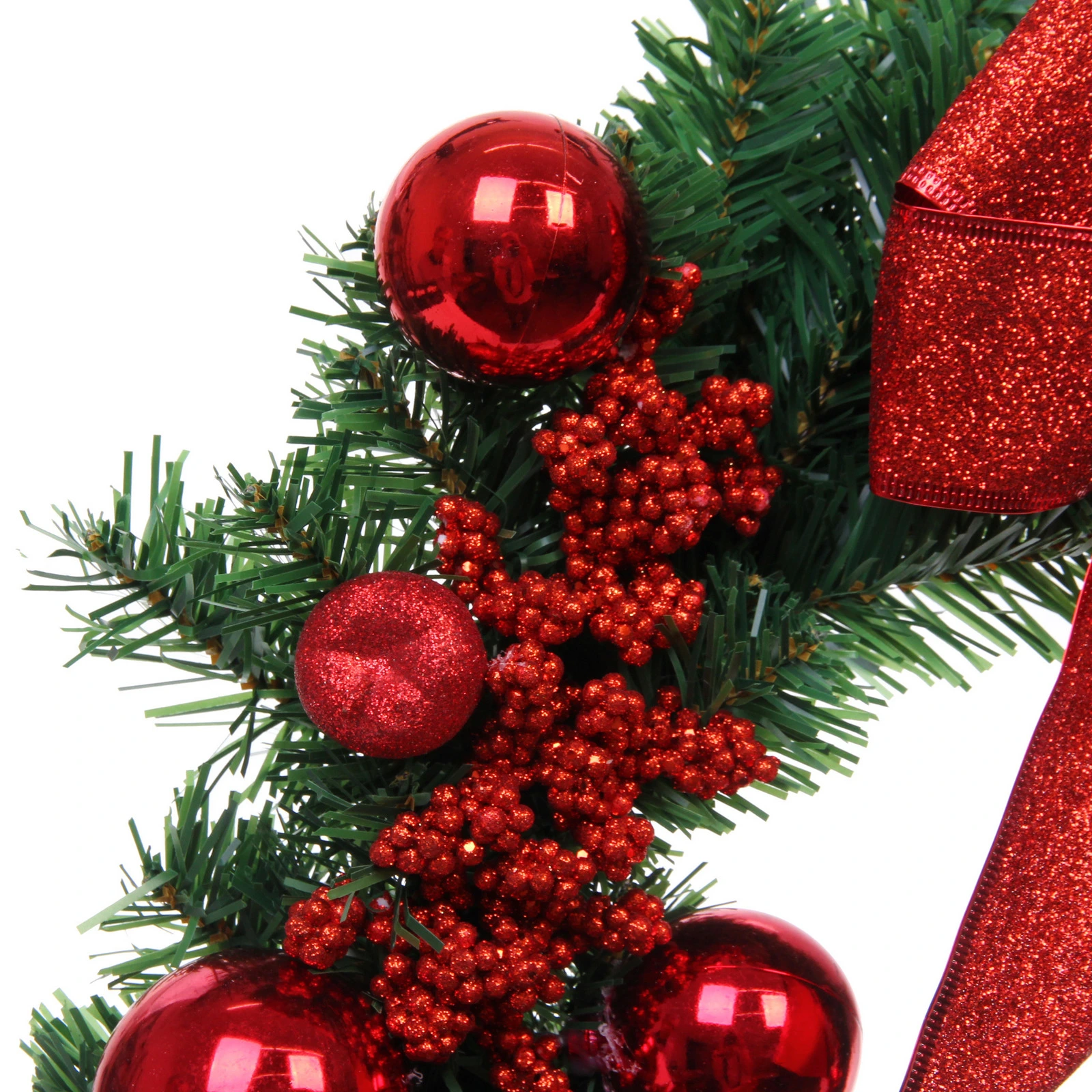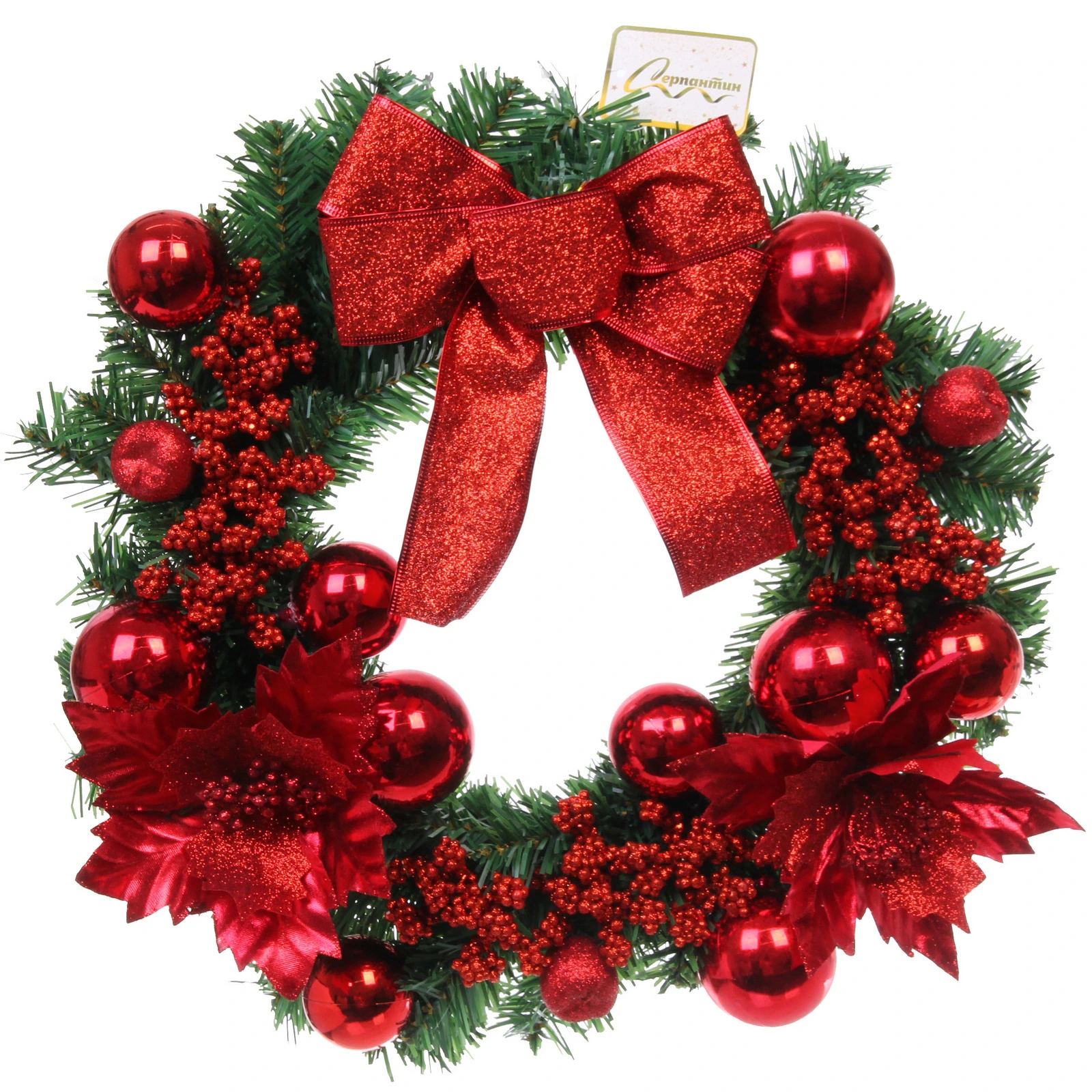 Размер венка составляет 40 см в диаметре, что делает его заметным элементом декора. Используемые материалы: ПВХ и металл, что обеспечивает прочность и долговечность. Венок украшен красными шарами и лентой, что подчеркивает его новогоднюю тематику.