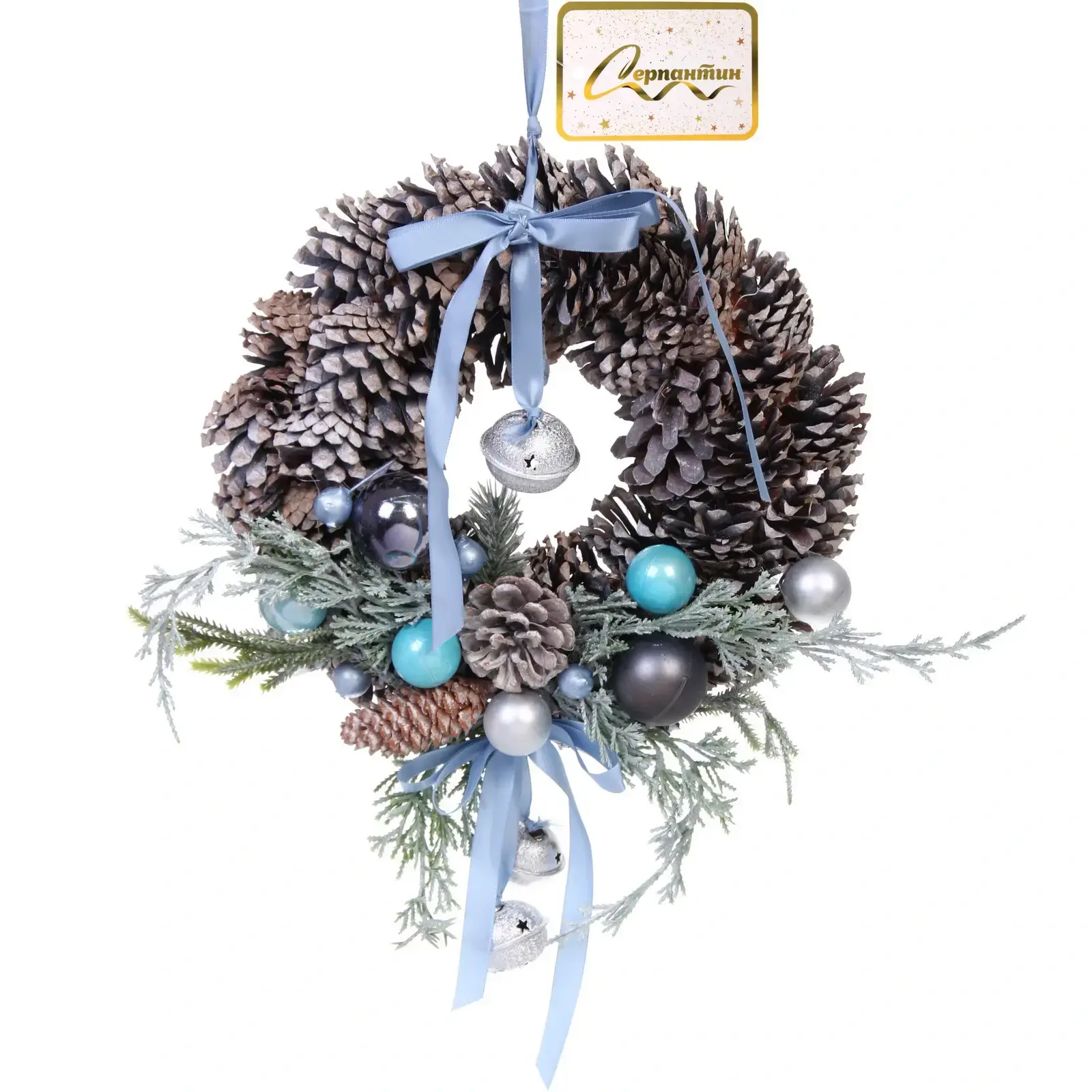 Новогодний венок «Волшебство» — идеальное украшение для дверей, стен или камина, которое мгновенно преобразит ваш интерьер. Сочетание натуралистичных шишек, глянцевых шаров и элегантных лент создаёт атмосферу волшебства и уюта.