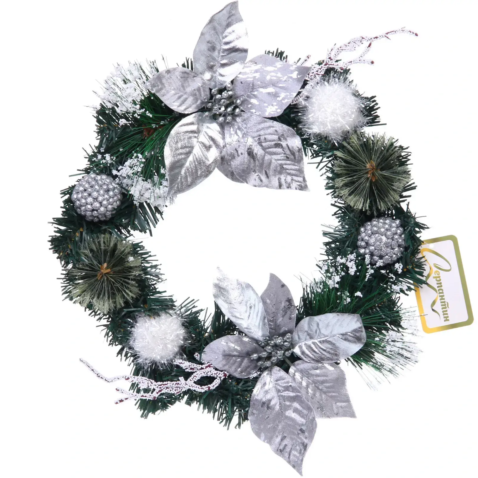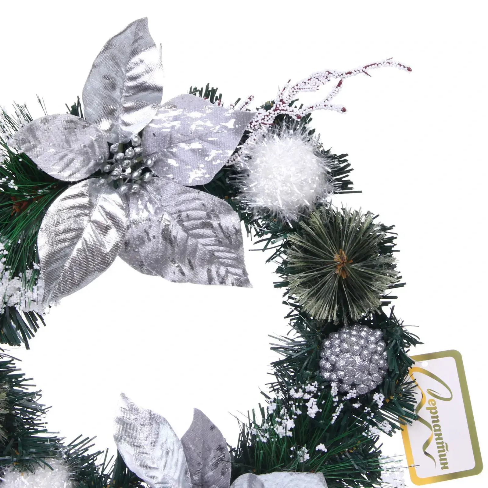 Этот венок отличается высоким качеством материалов: он изготовлен из синтетической хвои и металла, что обеспечивает долговечность и устойчивость к внешним воздействиям. Декоративные элементы, такие как серебристые листья и блестящие акценты, придают венку изысканный вид. Он не только красив, но и практичен — легко очищается от пыли и грязи.