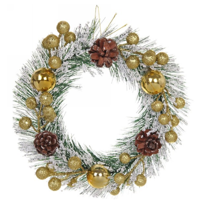 Венок выполнен из качественного ПВХ и пластика, устойчивых к деформации. Декор надёжно закреплён, что позволяет использовать изделие многократно, из года в год. Цветовая гамма включает насыщенный зелёный, сияющий золотой и природный коричневый. Отгружается один венок, цвет и оформление — как на изображении.