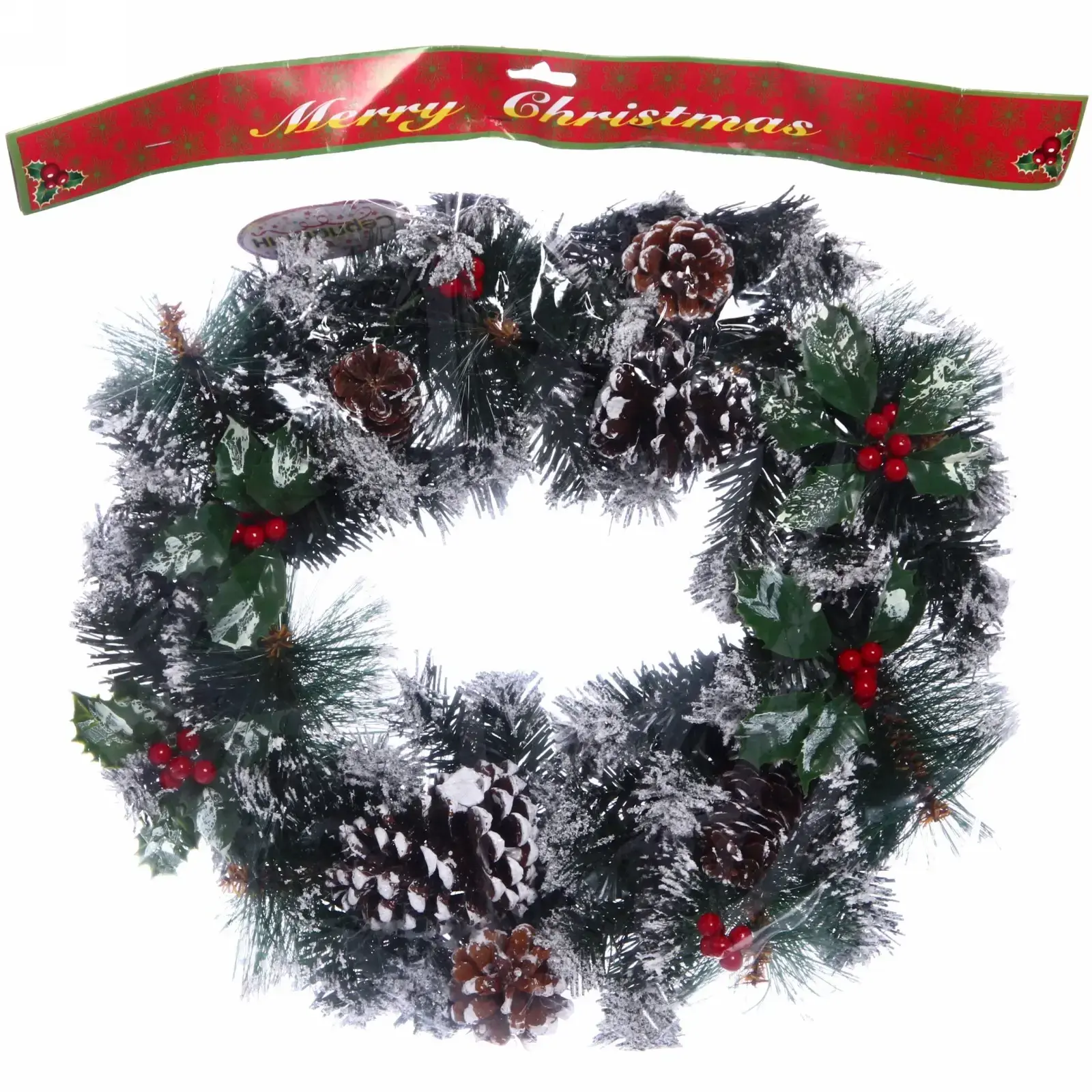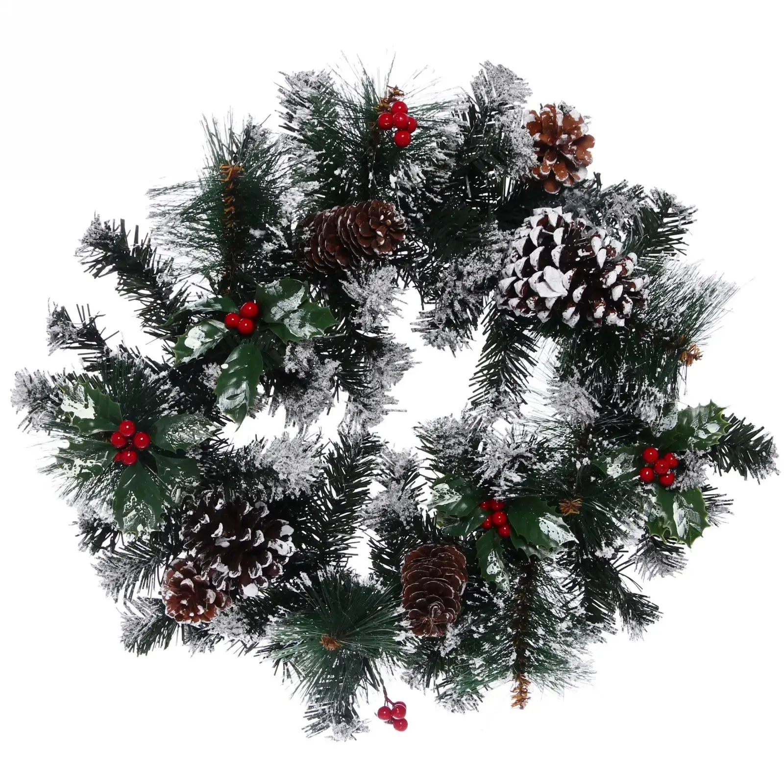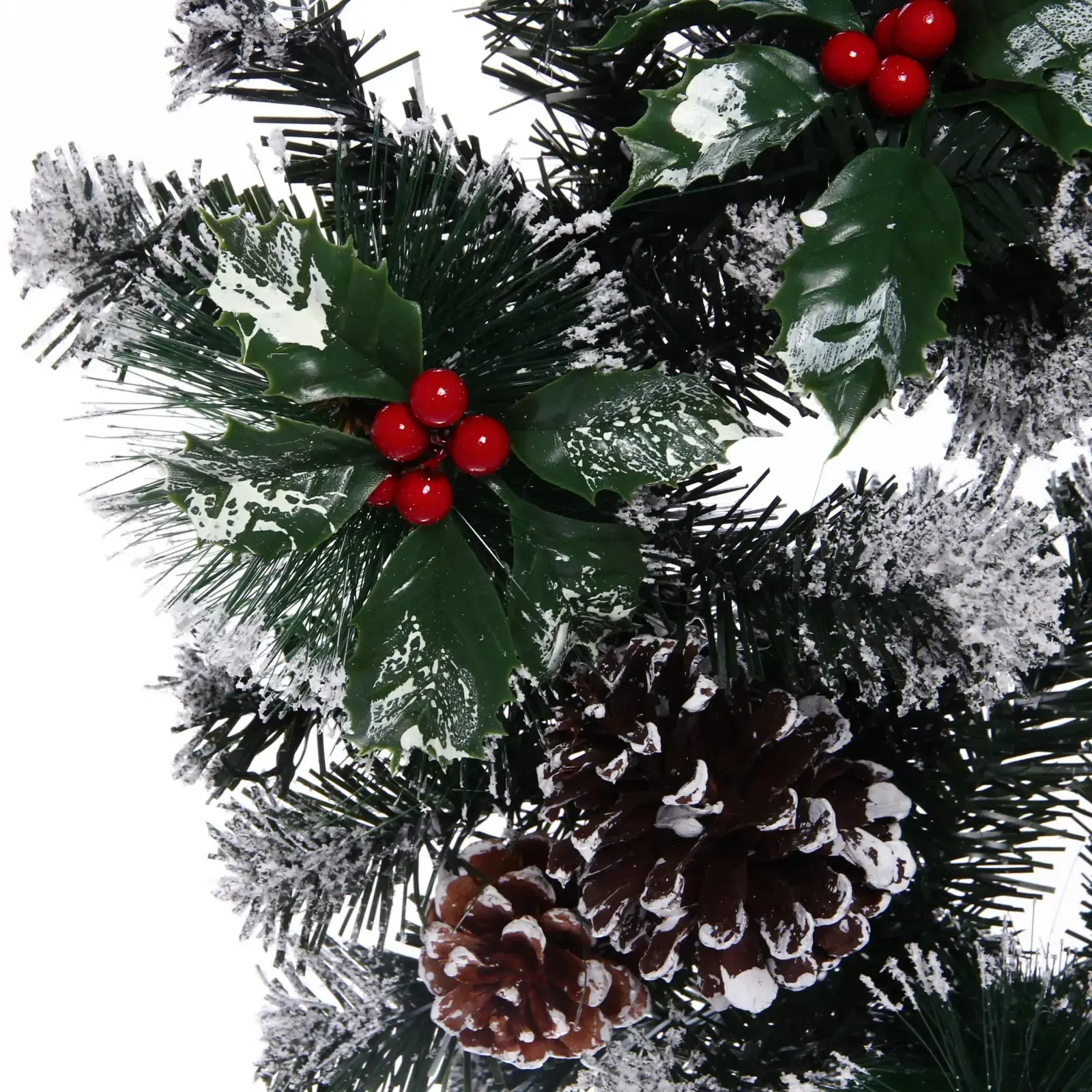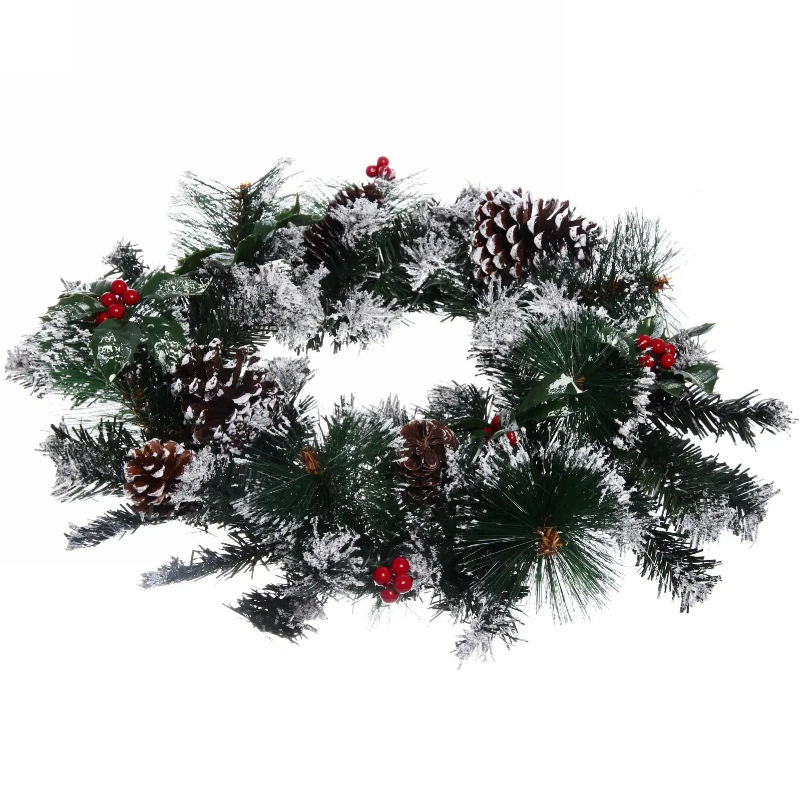 Венок имеет диаметр 40 см и украшен натуральными элементами — шишками и яркими ягодами, что придаёт ему реалистичный вид. Искусственные ветки хвои выполнены в насыщенном зелёном цвете и покрыты белым напылением, имитирующим снег, что создает эффект зимней сказки. Такой декор не только красив, но и практичен: он не требует особого ухода и сохранит свой вид на протяжении многих сезонов.