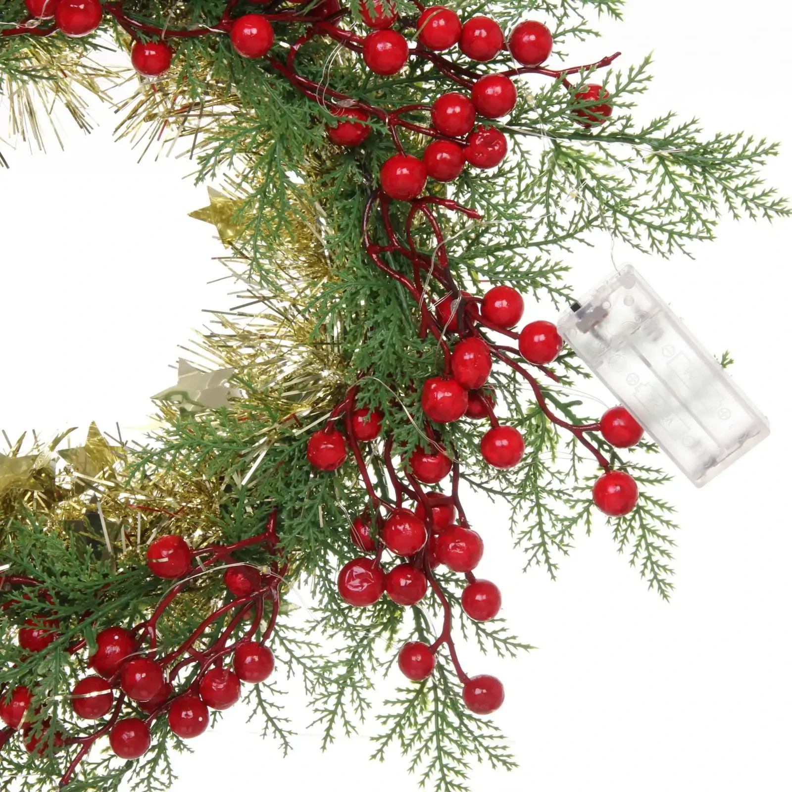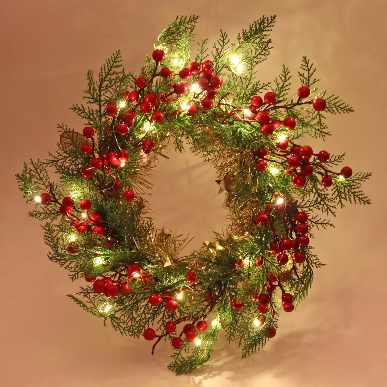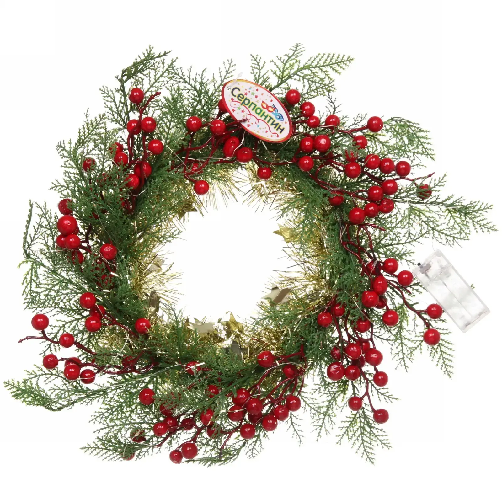 Этот новогодний венок с подсветкой станет идеальным украшением для вашего дома в праздничный сезон. Его яркие красные ягоды и зелёные ветви создают атмосферу уюта и радости, а встроенные огоньки добавляют волшебства в любое пространство. Венок диаметром 40 см легко впишется в любой интерьер, будь то входная дверь, гостиная или праздничный стол.