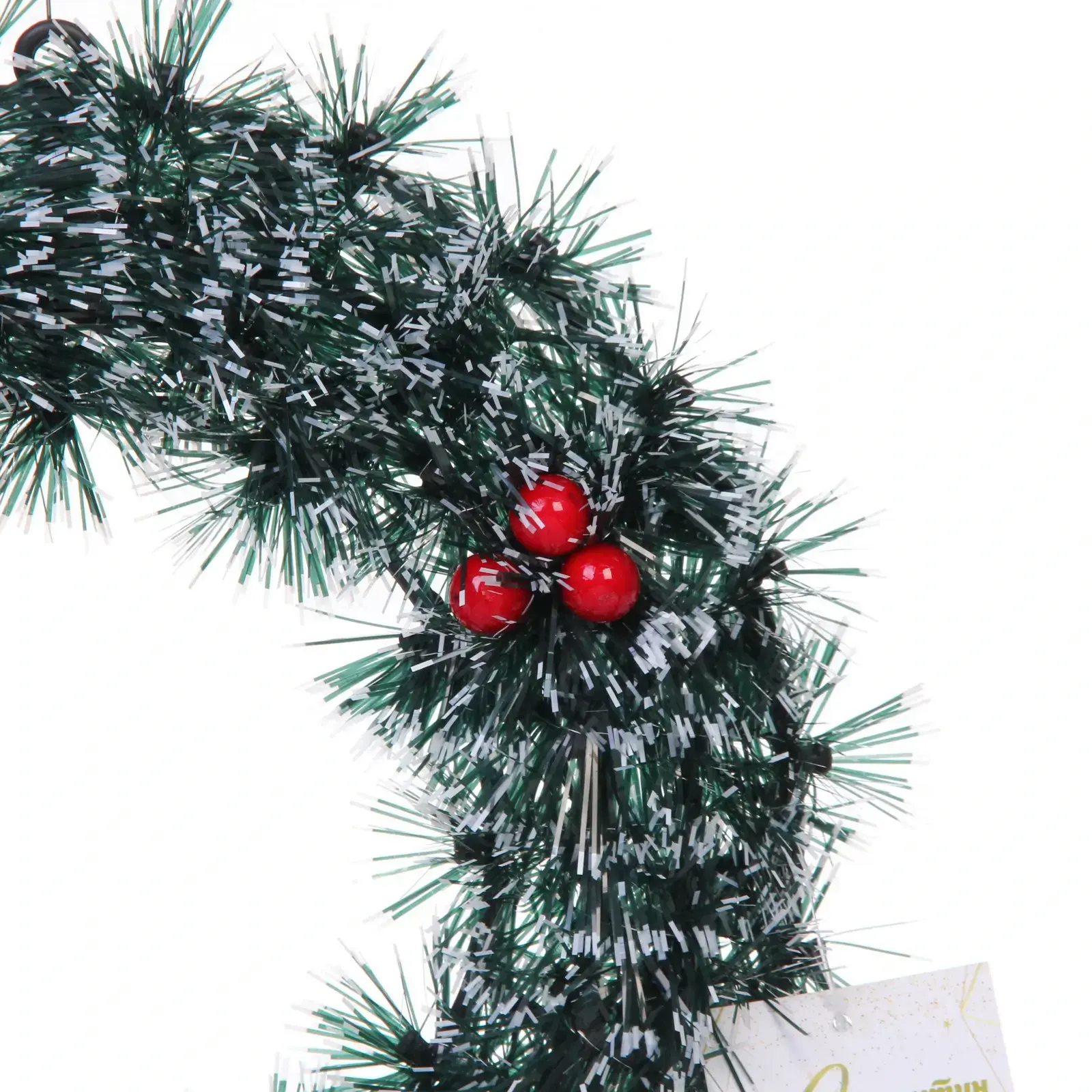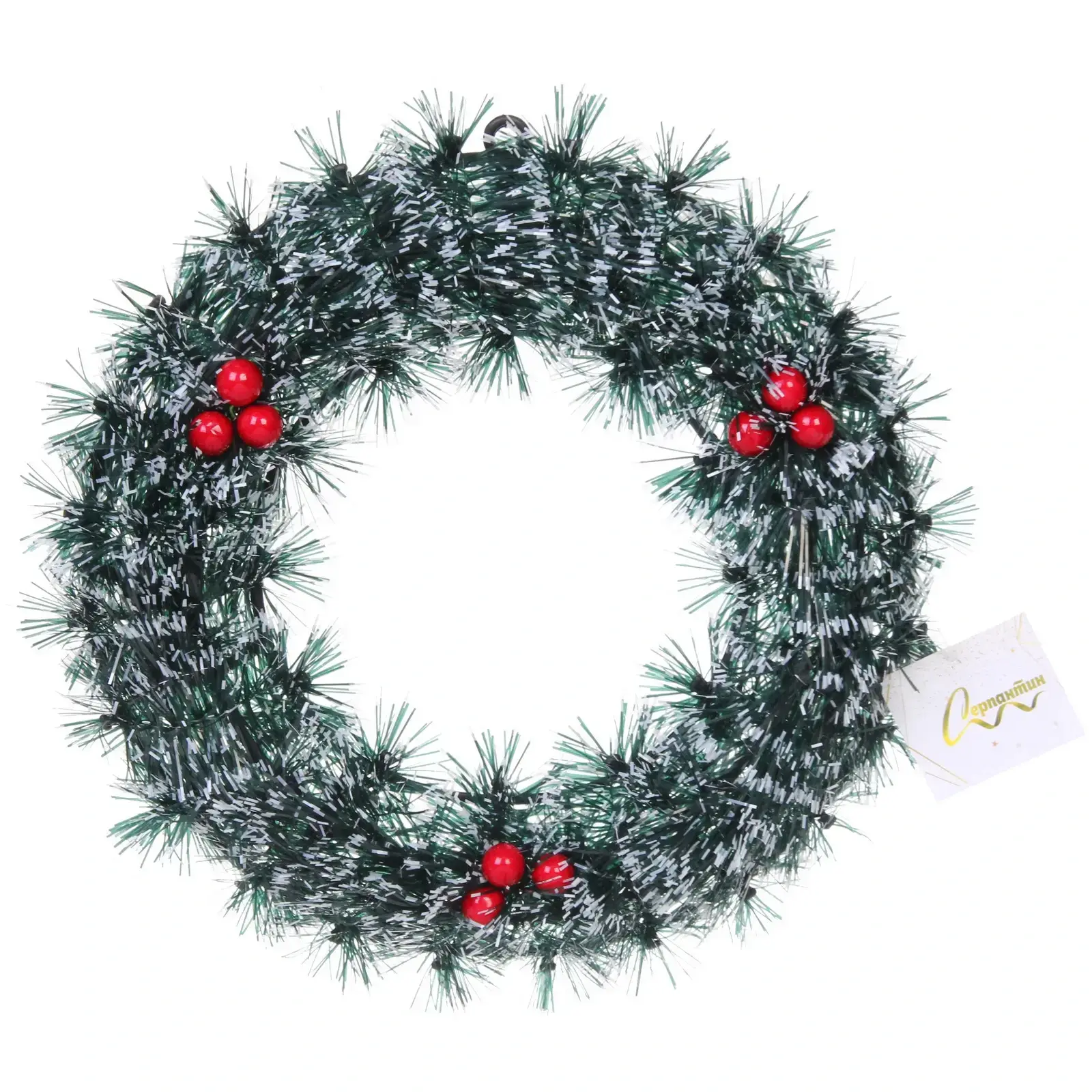 Венок изготовлен из качественного синтетического материала, который имитирует хвойные ветви и украшен блестящими элементами. Красные ягодки, расположенные по всему венку, добавляют яркие акценты и делают его более привлекательным. Этот венок не только красив, но и долговечен, что позволяет использовать его на протяжении многих сезонов.