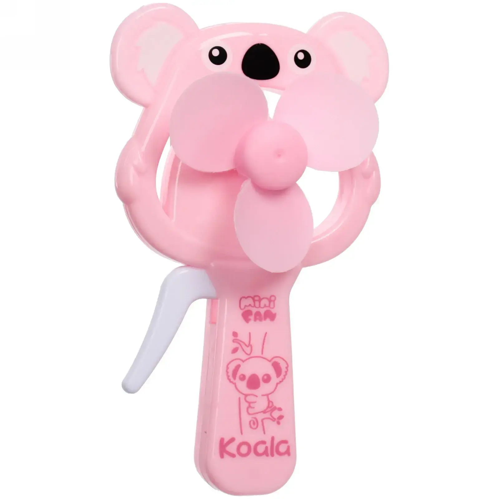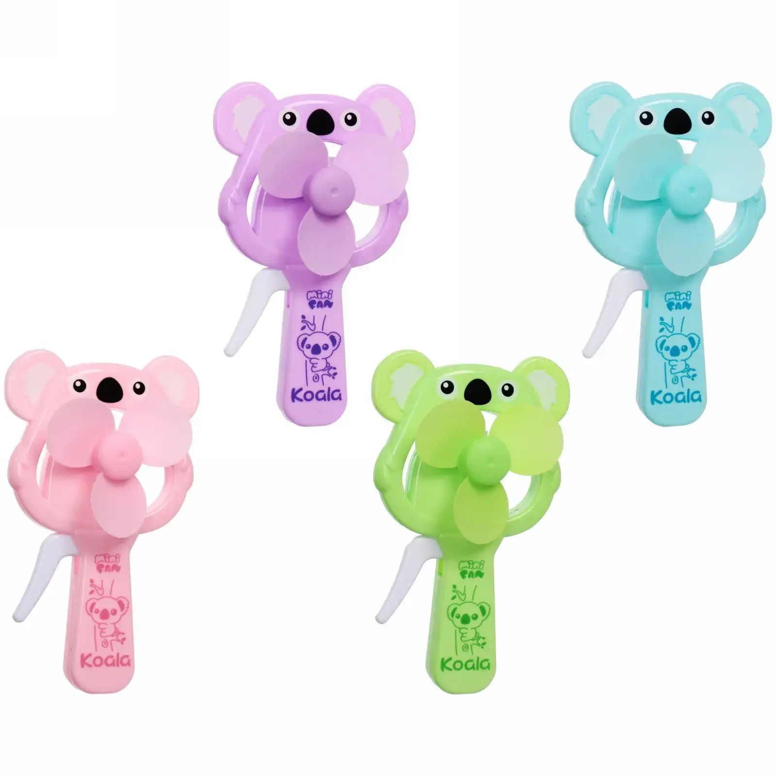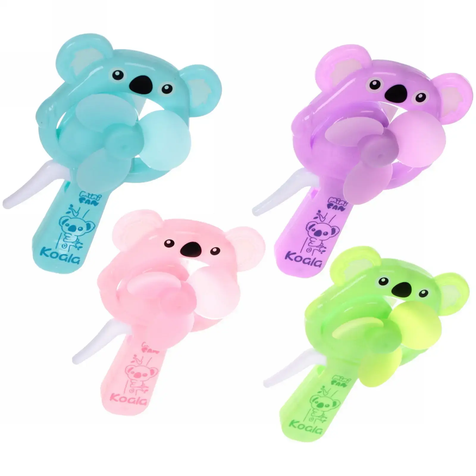 Вентилятор поставляется в случайном ярком цвете из доступных вариантов: светло-фиолетовый, розовый, зеленый или голубой. Каждое устройство украшено очаровательным изображением коалы и имеет маркировку 'Mini Fan Koala'.
