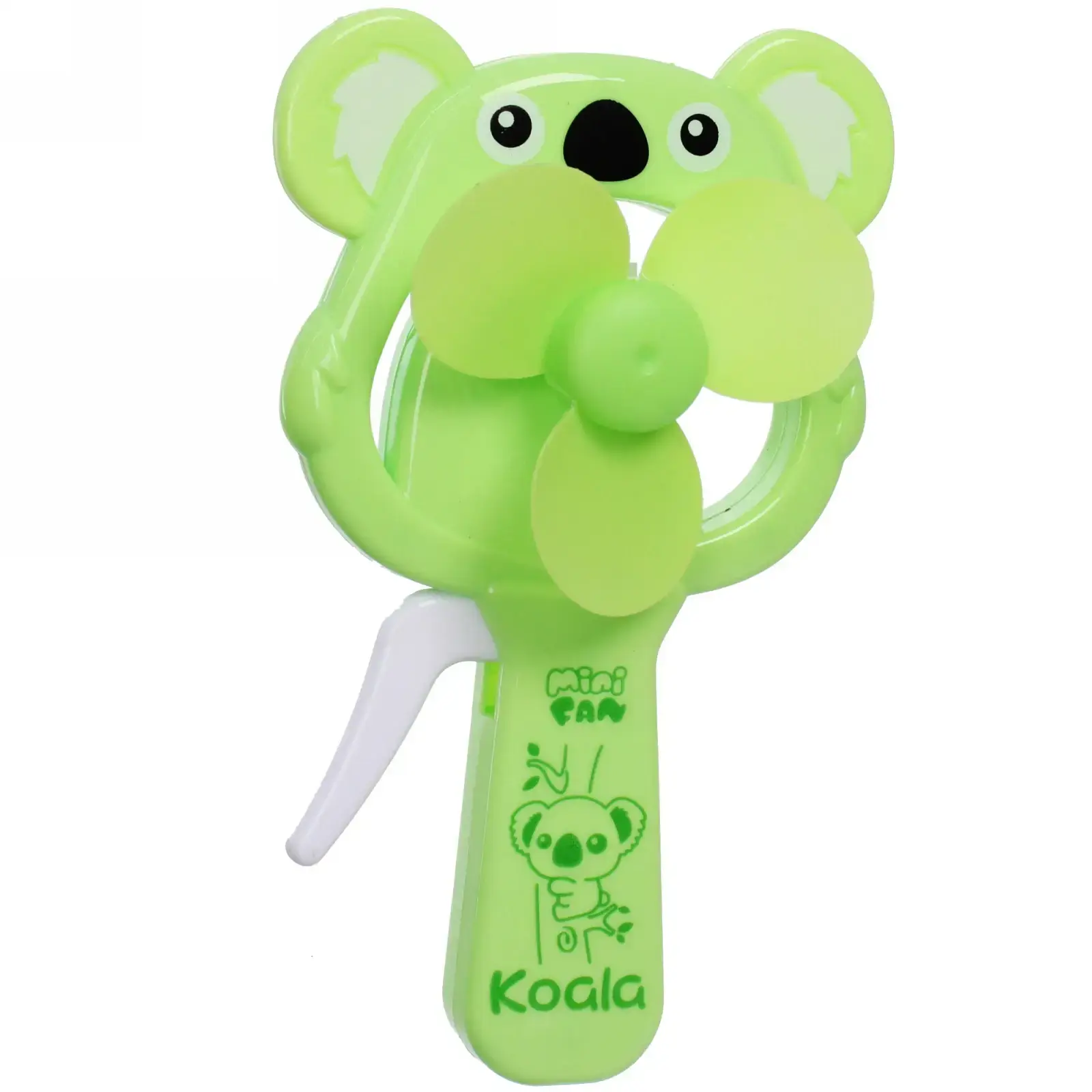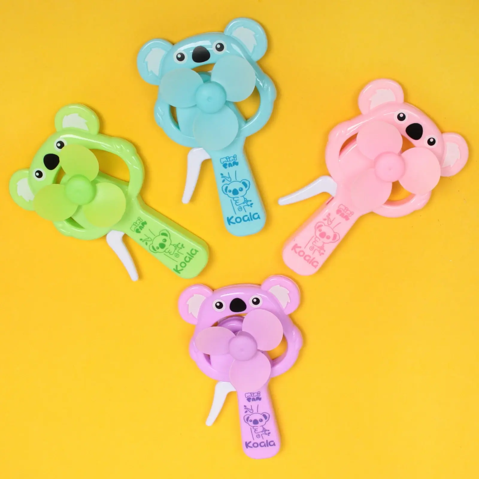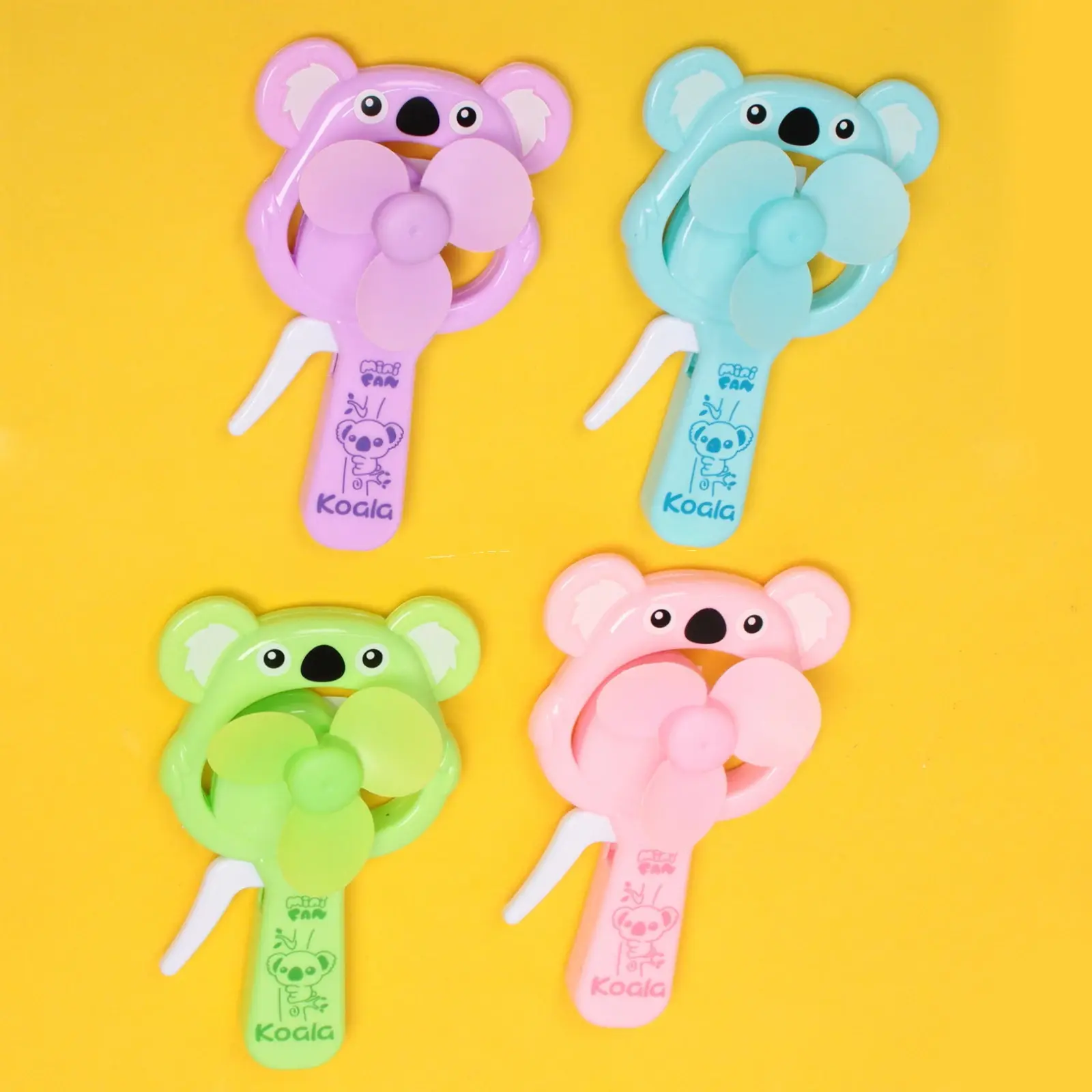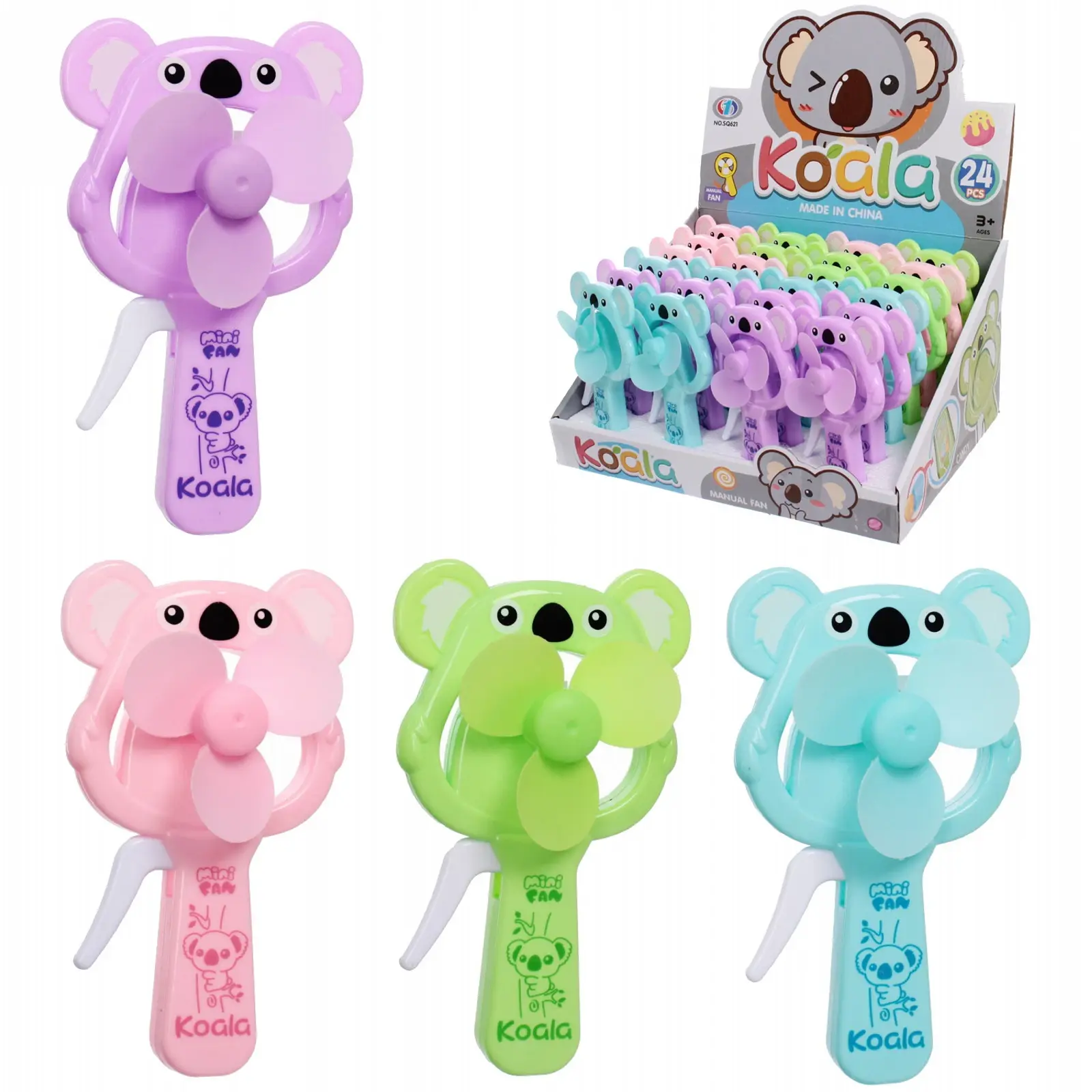 Вентилятор поставляется в случайном ярком цвете из доступных вариантов: светло-фиолетовый, розовый, зеленый или голубой. Каждое устройство украшено очаровательным изображением коалы и имеет маркировку 'Mini Fan Koala'.