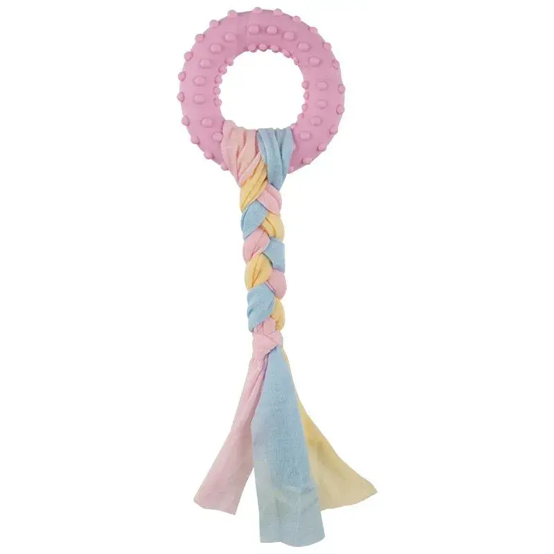 Игрушка сочетает силиконовое кольцо розового цвета с трехцветным плетеным хвостом из голубых, желтых и светло-розовых текстильных полос. Такая структура обеспечивает разнообразие тактильных ощущений во время игры.