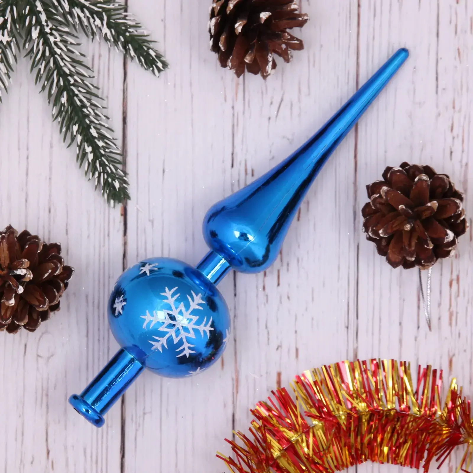 Эта великолепная верхушка на ёлку высотой 23 см станет идеальным завершающим акцентом вашего новогоднего декора. Выполненная в ярком голубом цвете с белым рисунком снежинки, она добавит нотку элегантности и праздничного настроения в ваш дом. Благодаря блестящей поверхности, верхушка будет красиво отражать свет, создавая волшебную атмосферу в вашем интерьере.