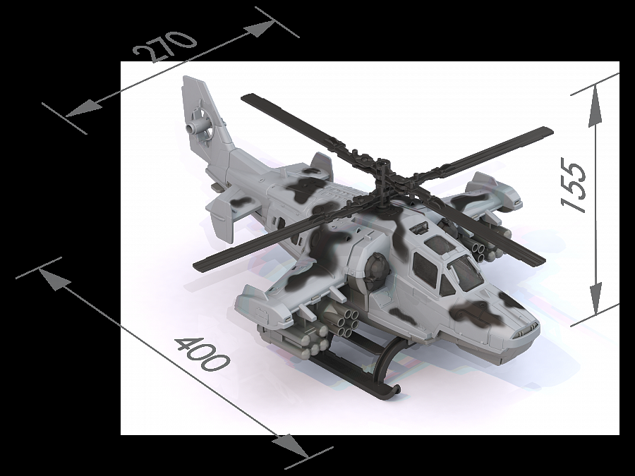 Размер – 40 см, материал – безопасный пластик, цвет – яркий с камуфляжным рисунком, что делает его особенно привлекательным. Пусть ваш малыш почувствует себя настоящим пилотом с этим оригинальным и практичным игрушечным вертолетом!»