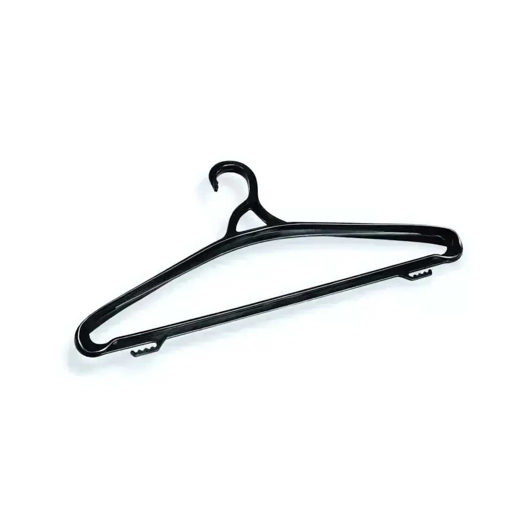 Черный цвет органично впишется в любое пространство — от шкафа-купе до прихожей. Монолитная конструкция без швов исключает повреждение тканей. Особое внимание при разработке уделено балансу между жесткостью и легким весом (всего 250 г).
