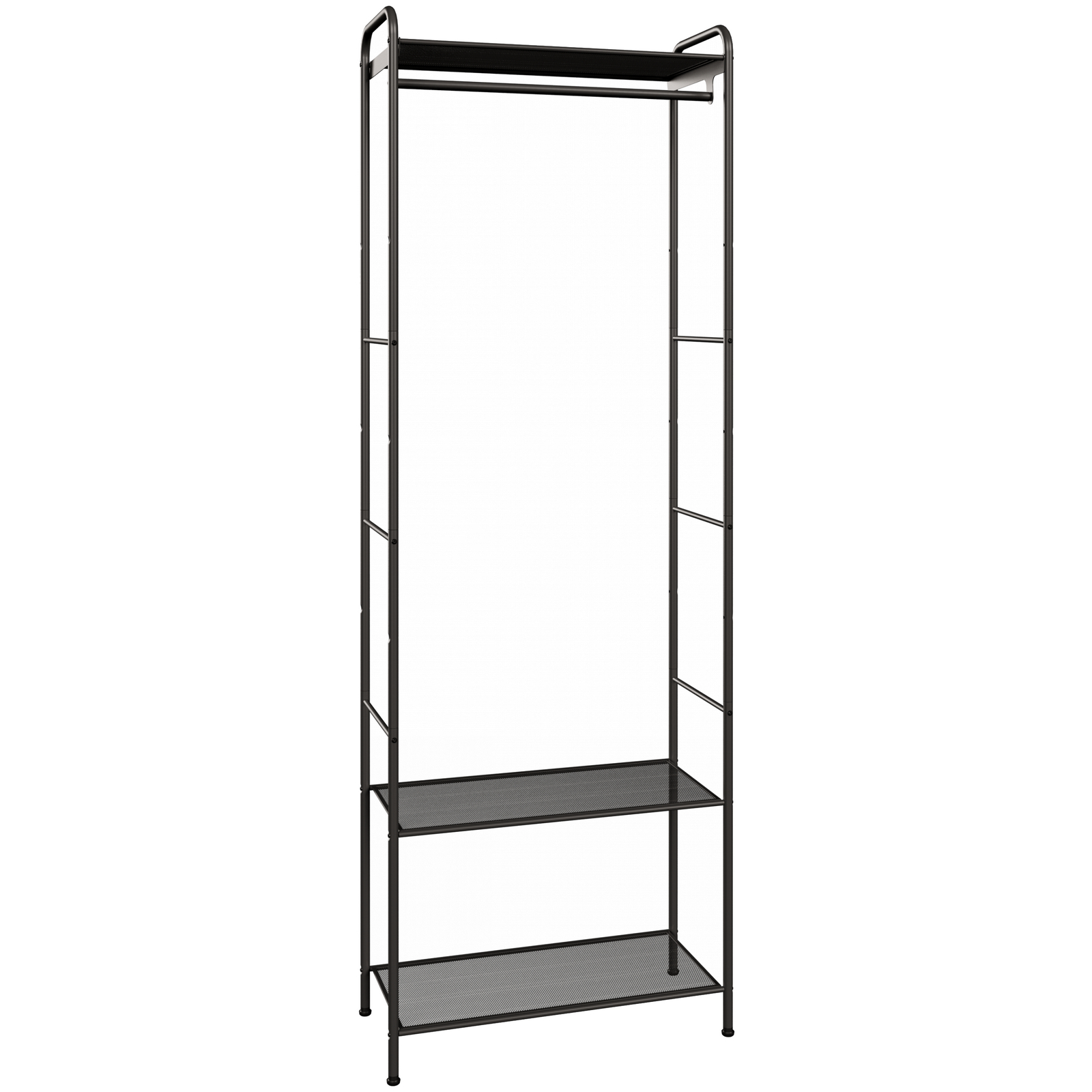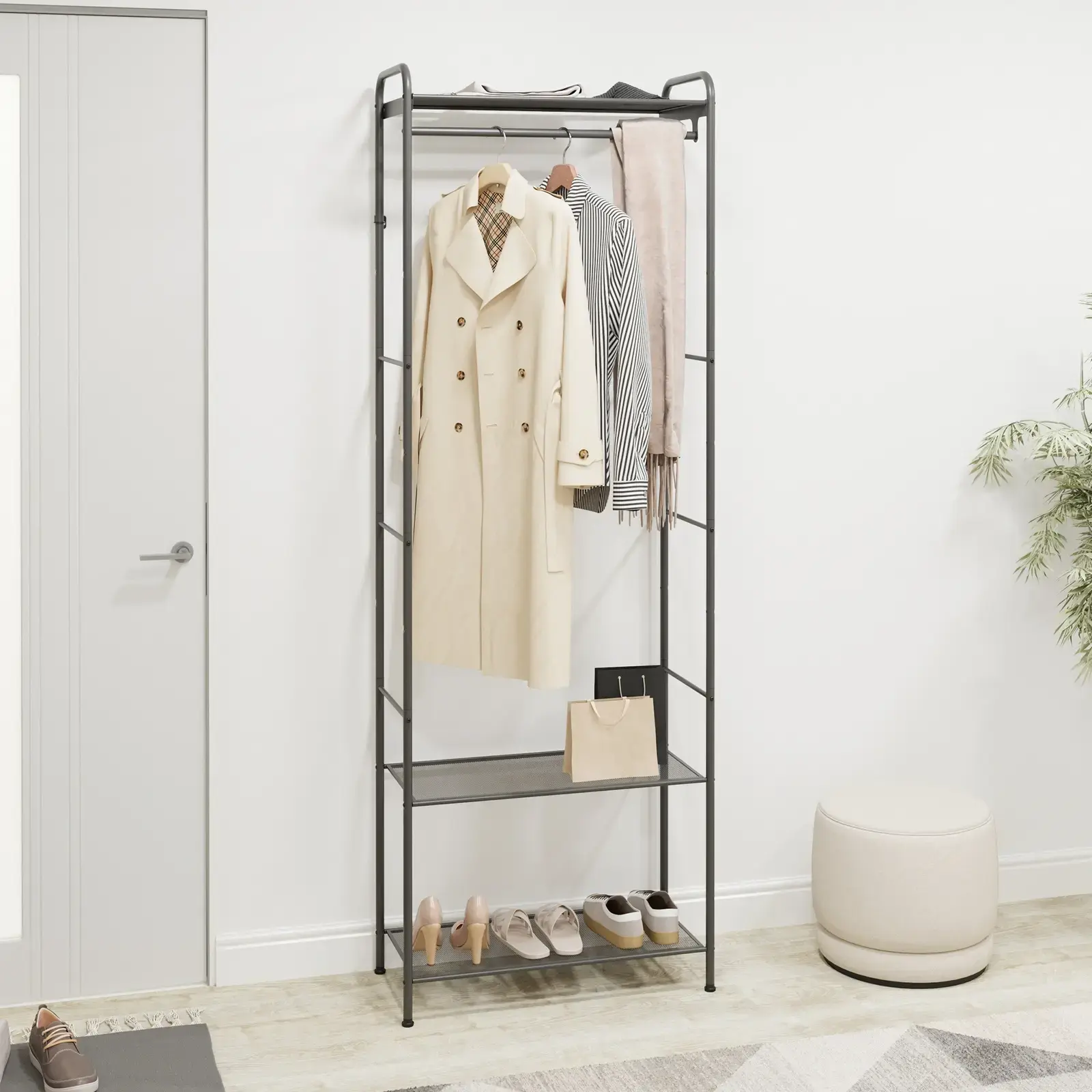 Компактная конструкция (поставляется в разобранном виде) легко трансформируется под ваши потребности. Верхняя перекладина рассчитана на 10 плечиков, а три уровня полок позволяют рационально использовать вертикальное пространство.