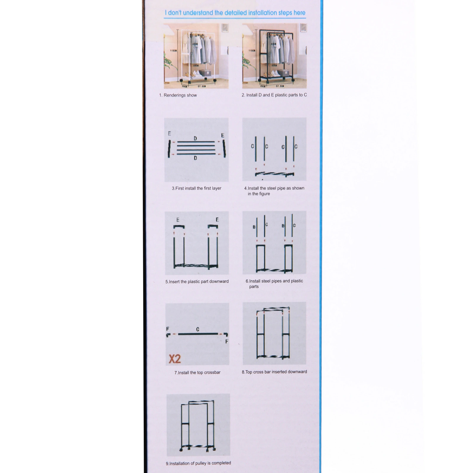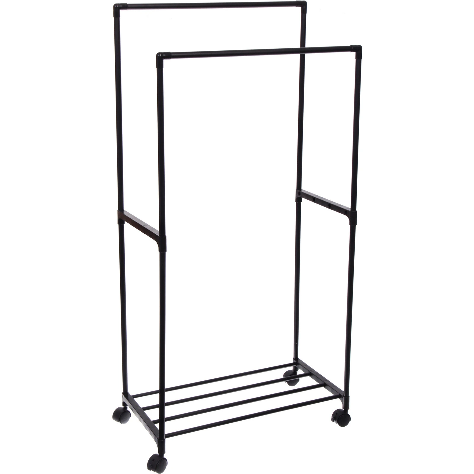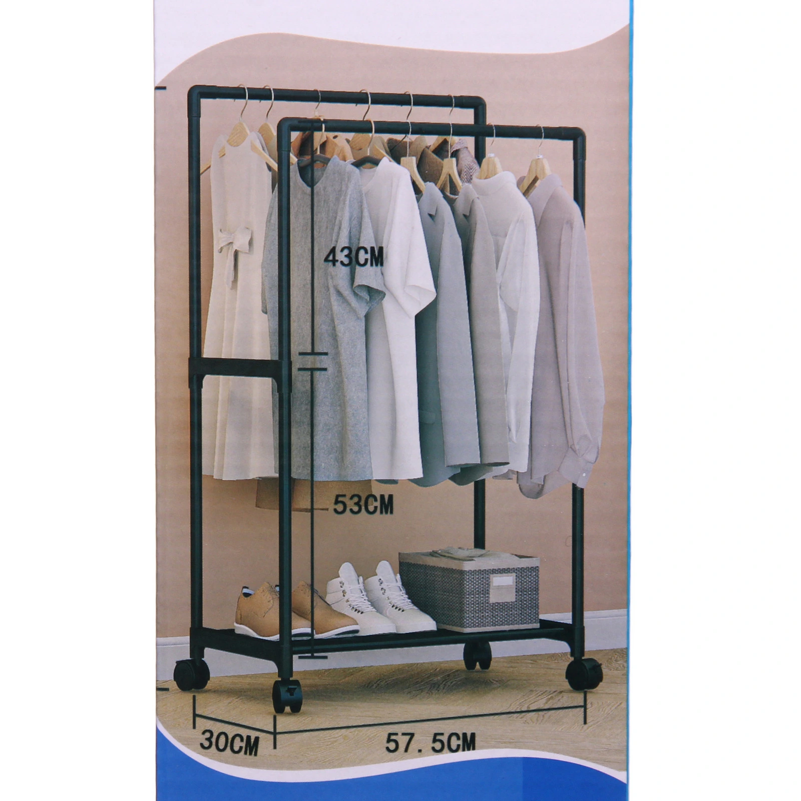 Модель оснащена двумя перекладинами для размещения одежды на плечиках, что позволяет аккуратно развесить рубашки, платья, верхнюю одежду и другие вещи. Нижняя полка подходит для хранения обуви, коробок или аксессуаров. Открытая конструкция обеспечивает быстрый доступ к вещам и визуальный контроль порядка.