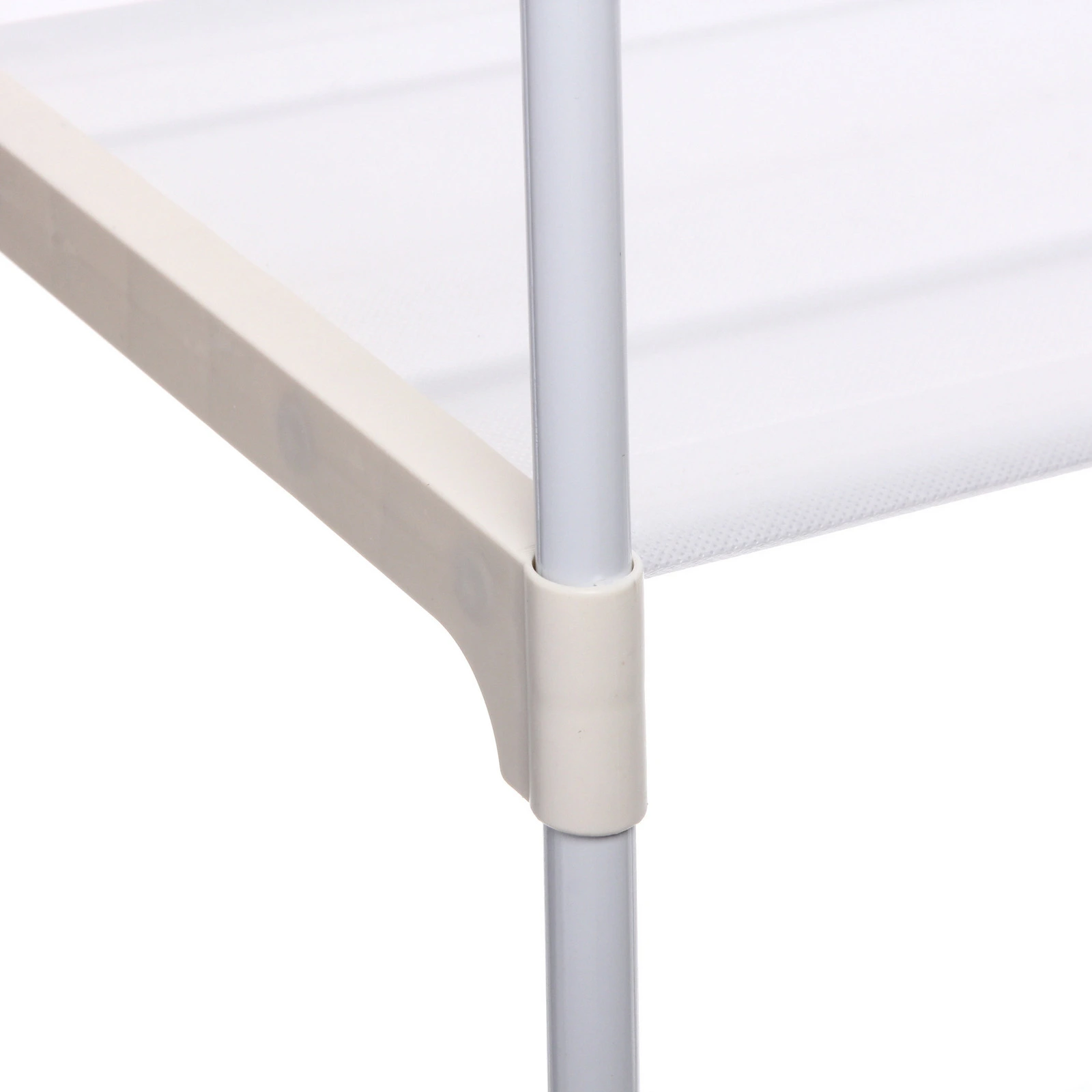 Размер в собранном виде — 55х42х160 см. Каркас выполнен из металла и пластика, полки — из плотного нетканого материала. Белый цвет легко вписывается в современный интерьер и визуально не перегружает пространство.