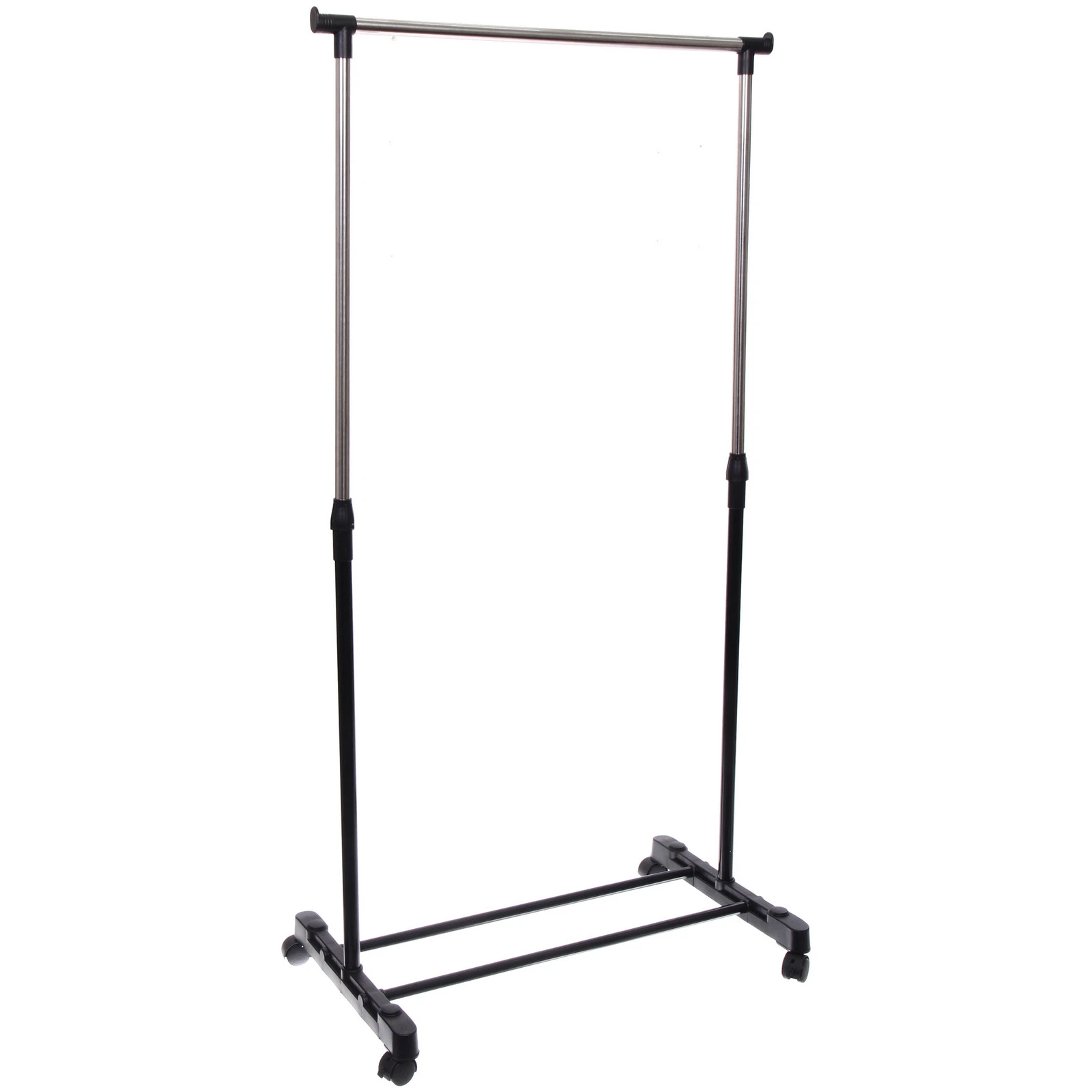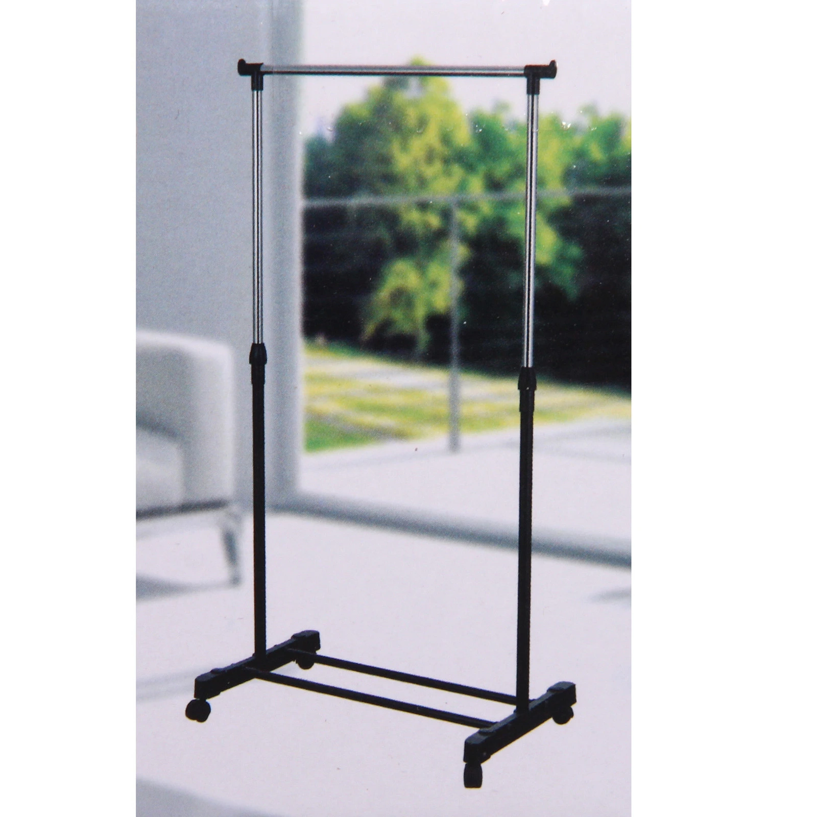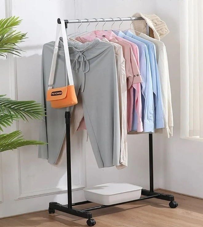 Стойка оснащена надежной телескопической системой, которая позволяет регулировать высоту под ваши индивидуальные нужды — от коротких рубашек и пиджаков до длинных платьев и пальто. Колеса обеспечивают плавное перемещение по любой поверхности, позволяя легко менять планировку комнаты или перемещать одежду к зеркалу. Специальные рычаги-фиксаторы на колесах гарантируют устойчивость конструкции в выбранном месте, предотвращая случайное скольжение.