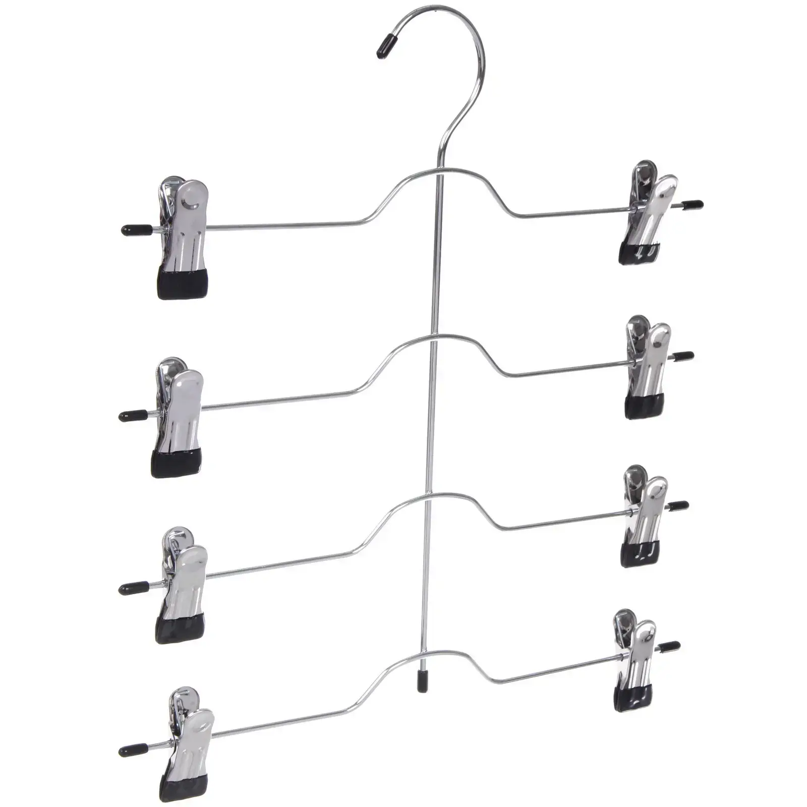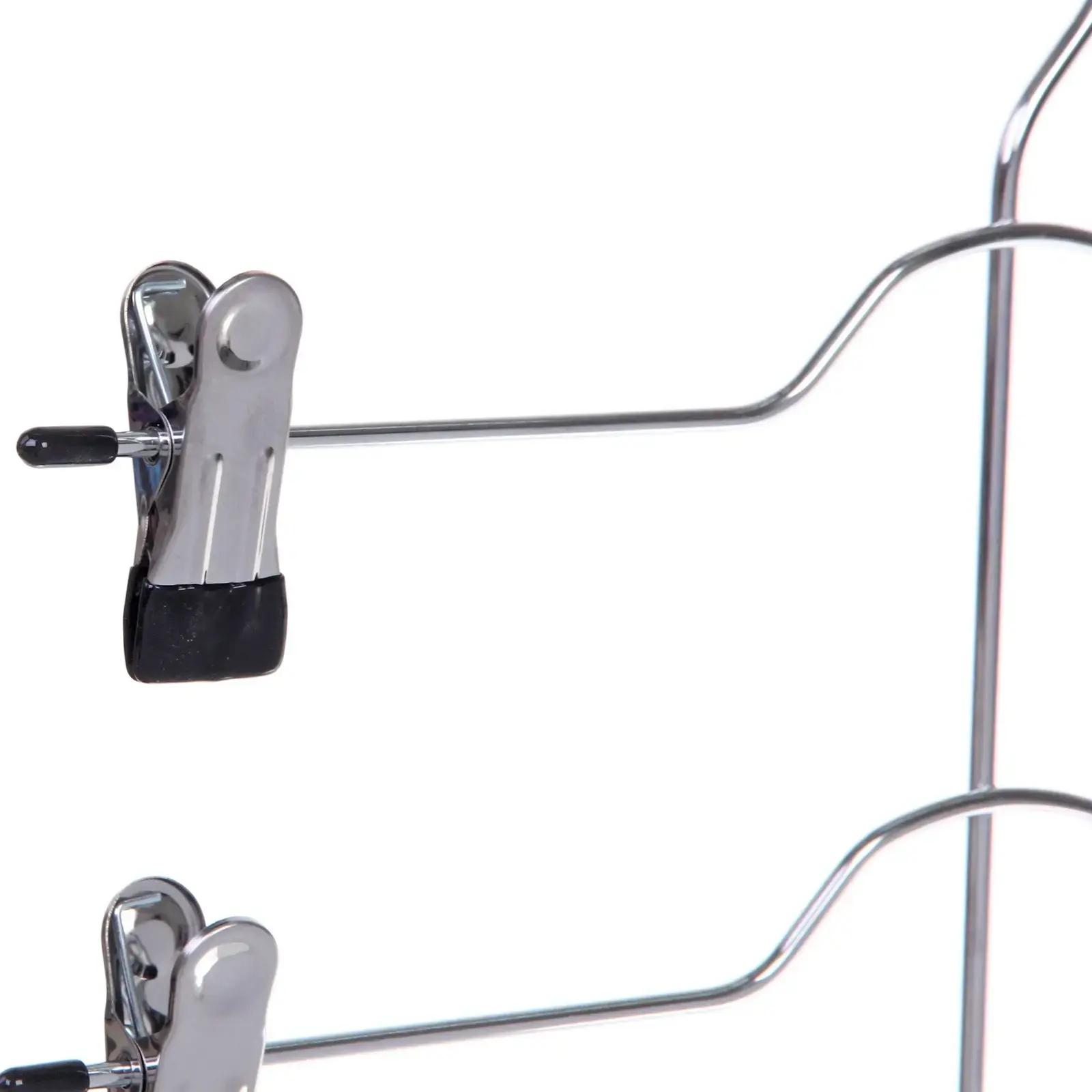 Эта вешалка предназначена для использования в домашних условиях, а также в гардеробных и на балконах. Она легко подвешивается благодаря удобному крючку в верхней части, что позволяет экономить пространство и поддерживать порядок. Металлическая конструкция с хромированным покрытием обеспечивает долговечность и надежность, а черные пластиковые накладки на зажимах предотвращают повреждение ткани.